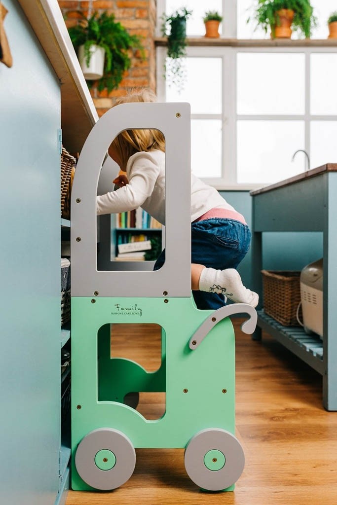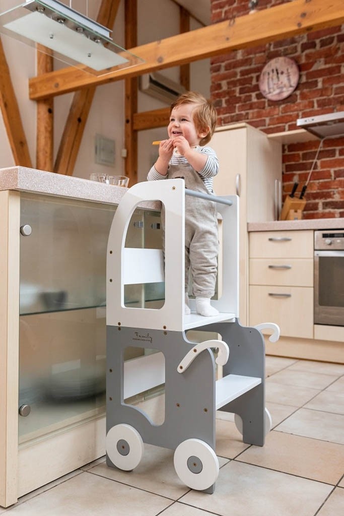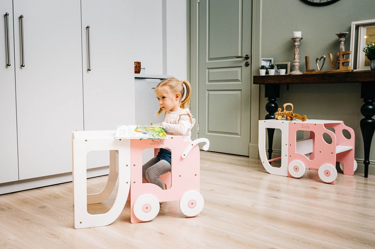 Stolček pomagalček lahko otrok uporabi kot pručko, da bo lažje dosegel višje površine, kot so umivalnik, jedilna miza ali kuhinjski pult, zato se lahko sam umije, ustvarja in aktivno sodeluje pri pripravi hrane. Pručko lahko enostavno spremenite v set mizice in stola, katerega lahko otrok uporabi za hranjenje ali ustvarjanje.
