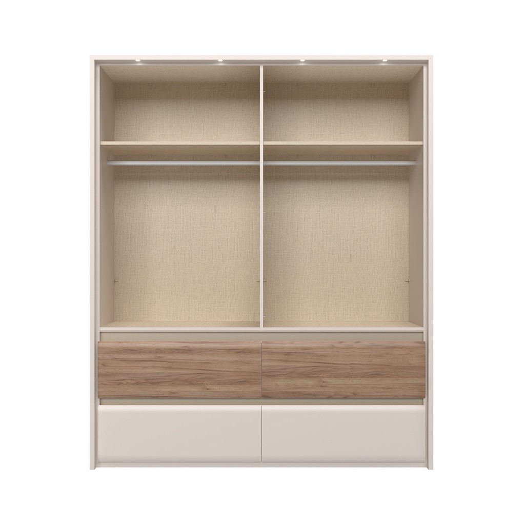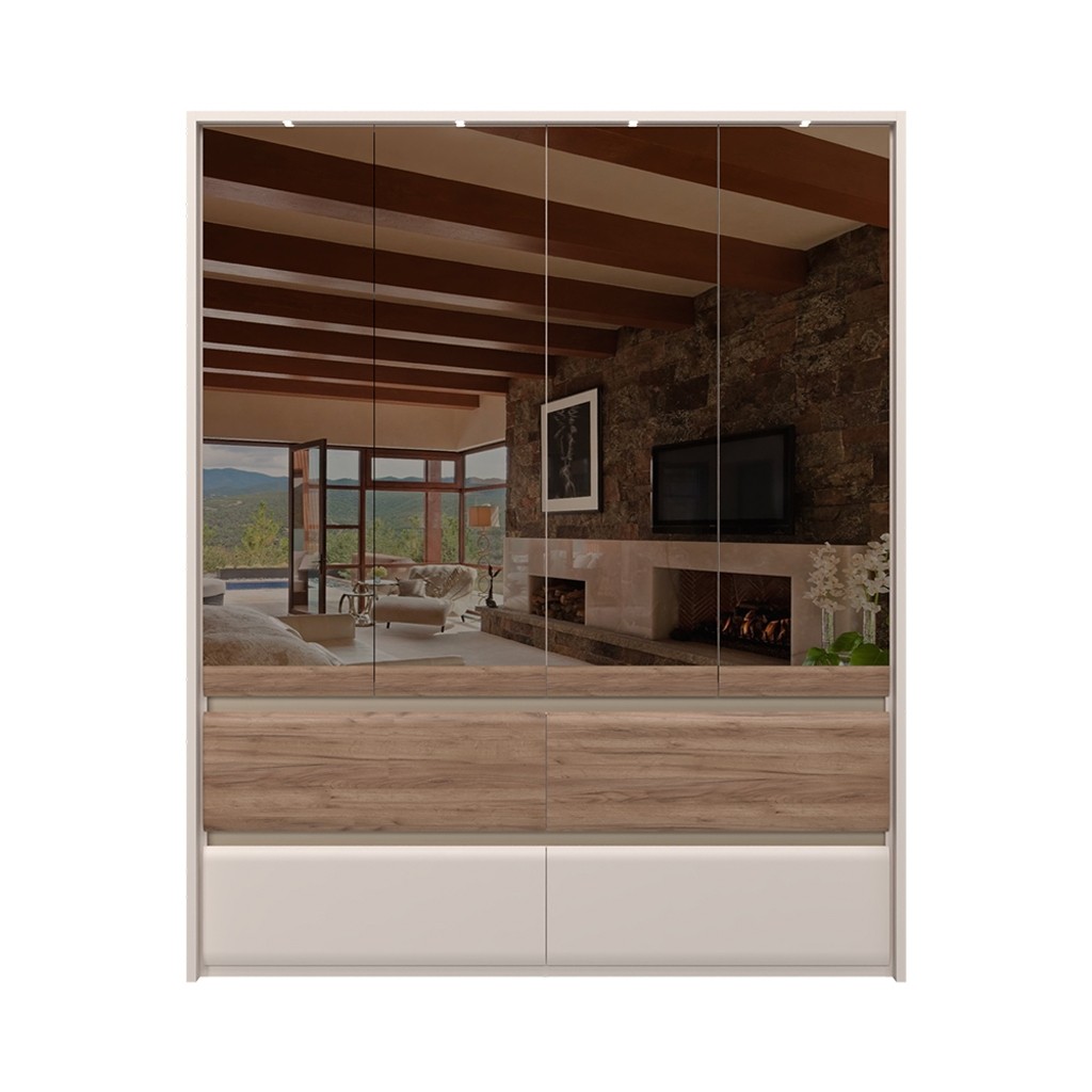 4-delna Garderobna omara INVICTUS P44-4OG/IC je primerna za vse, ki si želijo poživeti spalnico. Spalnica je izdelana iz kvalitetnih materialov, ki omogočajo dolgotrajno uporabo. Omara vsebuje dve obešalni palici, štiri predale, dve polici in ogledalo čez celotno omaro, kar vam omogoča urejen videz in optično povečan prostor. Omara je na voljo v barvni kombinaciji kašmirja in tobako hrasta. Omara vsebuje dekorativni okvir in LED osvetlitev.