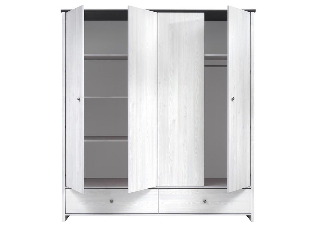 4-delna garderobna omara PORTO je modernega izgleda in je primerna za večje spalne prostore. Vsebuje kar štiri vratca in dva predala kar vam omogoča veliko shranjevalnega prostora. Na voljo je v svetlo sivi barvi bora, ki se odlično poda v vsako spalnico.