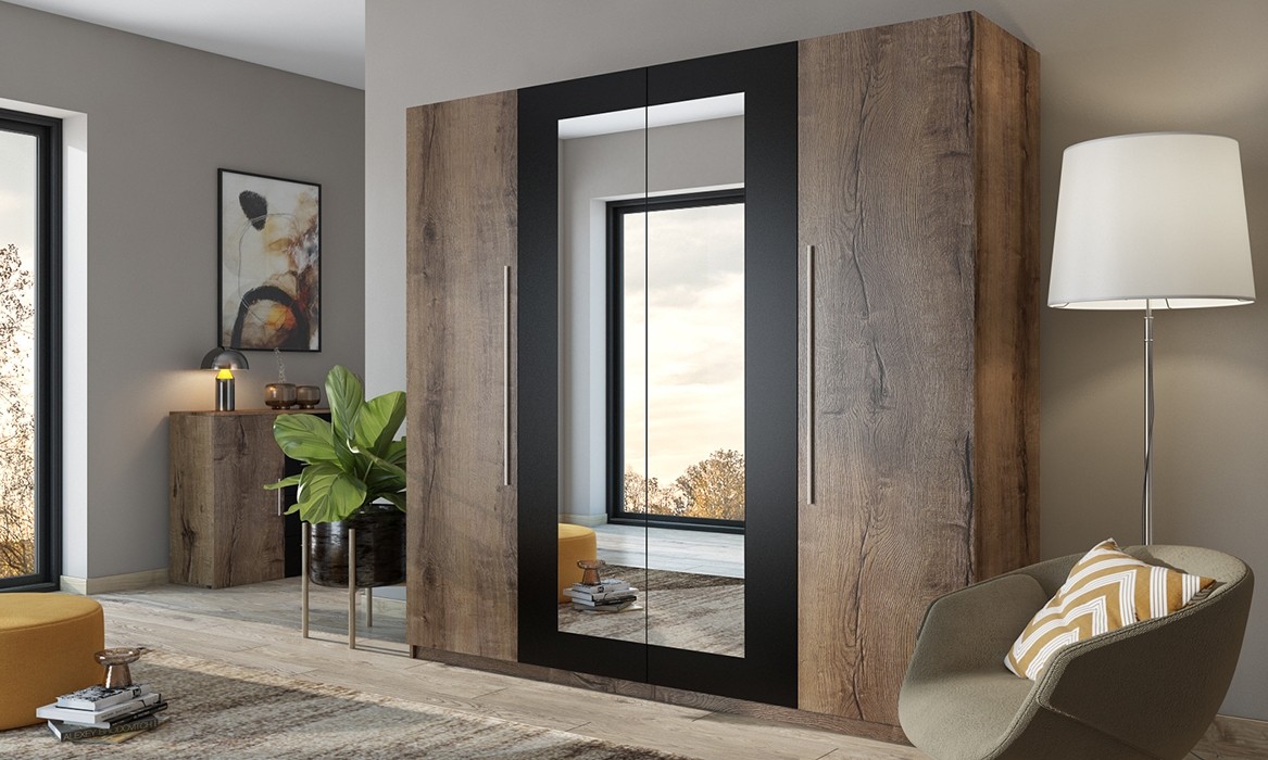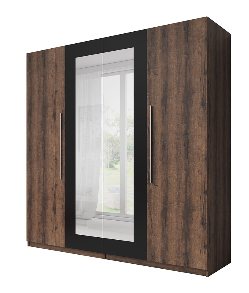 Garderobna omara VERA je na voljo v kombinaciji barv samostanskega hrasta in črne. Vsebuje veliko shranjevalne površine za vaša oblačila, da bo vaša spalnica vedno izgledala čisto in urejeno. Omara vsebuje tudi veliko ogledalo, ki vam omogoči, da boste od doma odšli vedno urejeni.