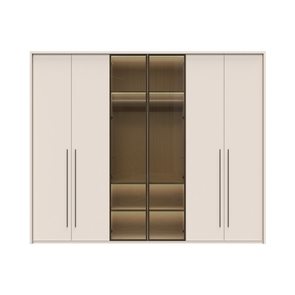 Omara ima šest vrat, od katerih so štiri lakirana v kašmir barvi s soft mat UV lakom, dve pa sta stekleni z aluminijastim okvirjem. Dekorativno profilirani MDF okvirji na frontah dodajo pridih elegance. Korpus omare je debeline do 25 mm in je prav tako v kašmir barvi.