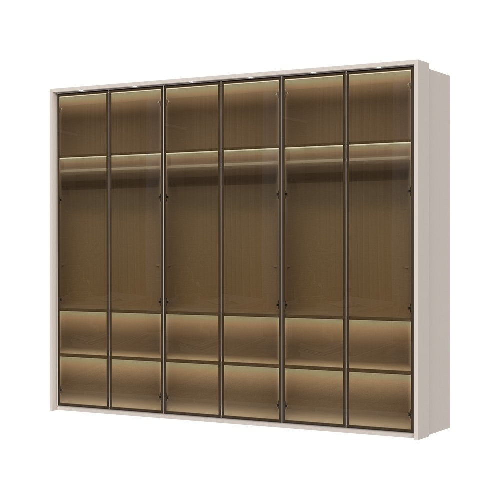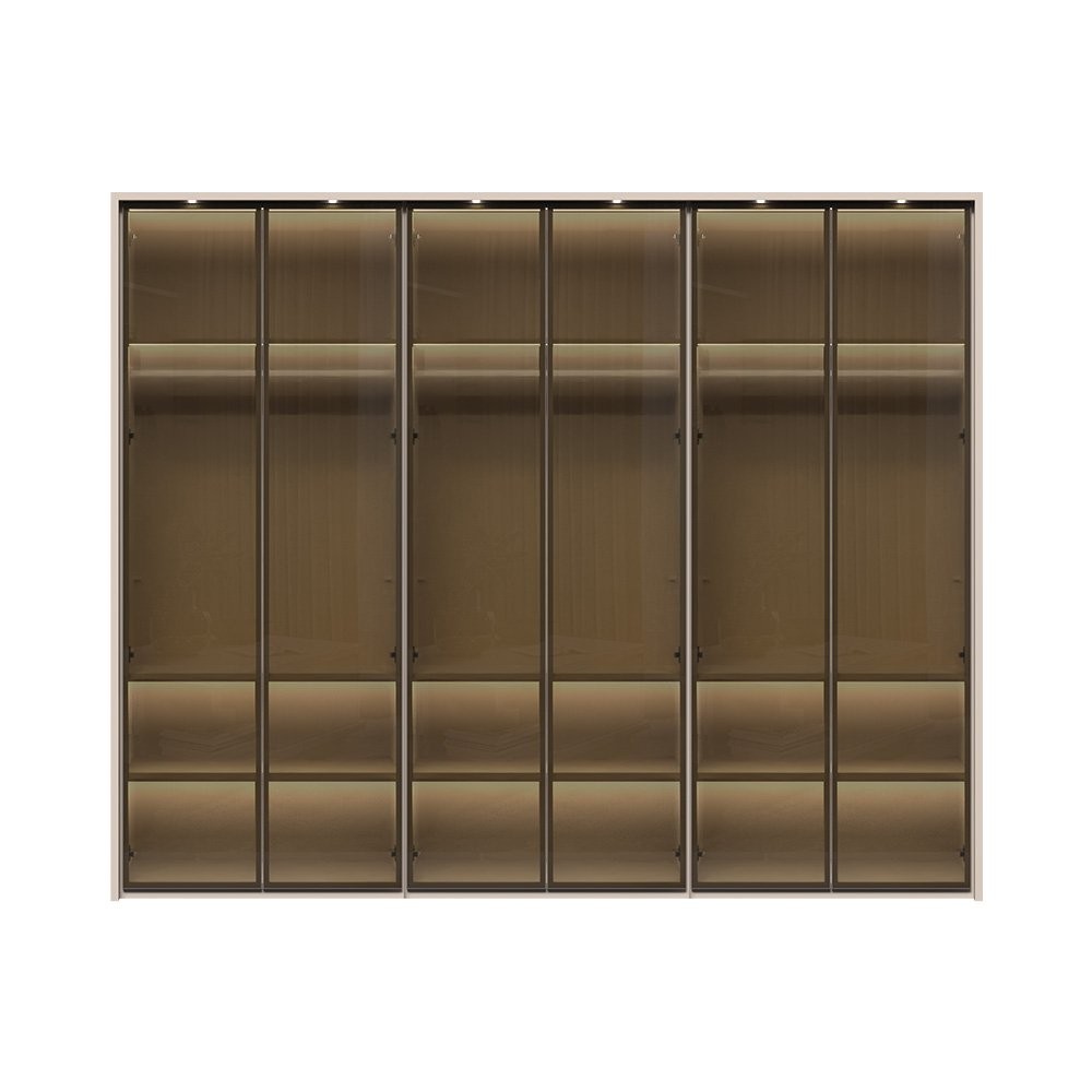 6-delna garderobna omara Kalla Opera P6B-6AL je elegantna in funkcionalna rešitev za vašo spalnico. S svojim prefinjenim dizajnom in kakovostnimi materiali nudi dovolj prostora za shranjevanje vaših oblačil in dodatkov. Prefinjena barva Kašmir in steklena fronta z aluminijastim okvirjem ustvarjata sodoben videz, ki se odlično poda v vsak dom.