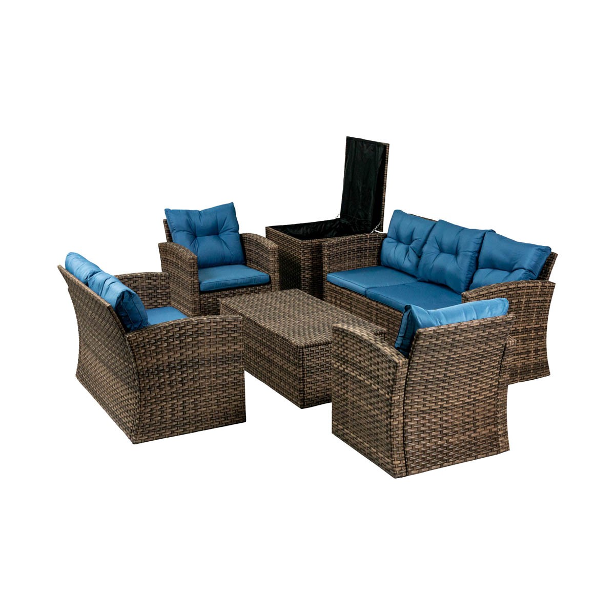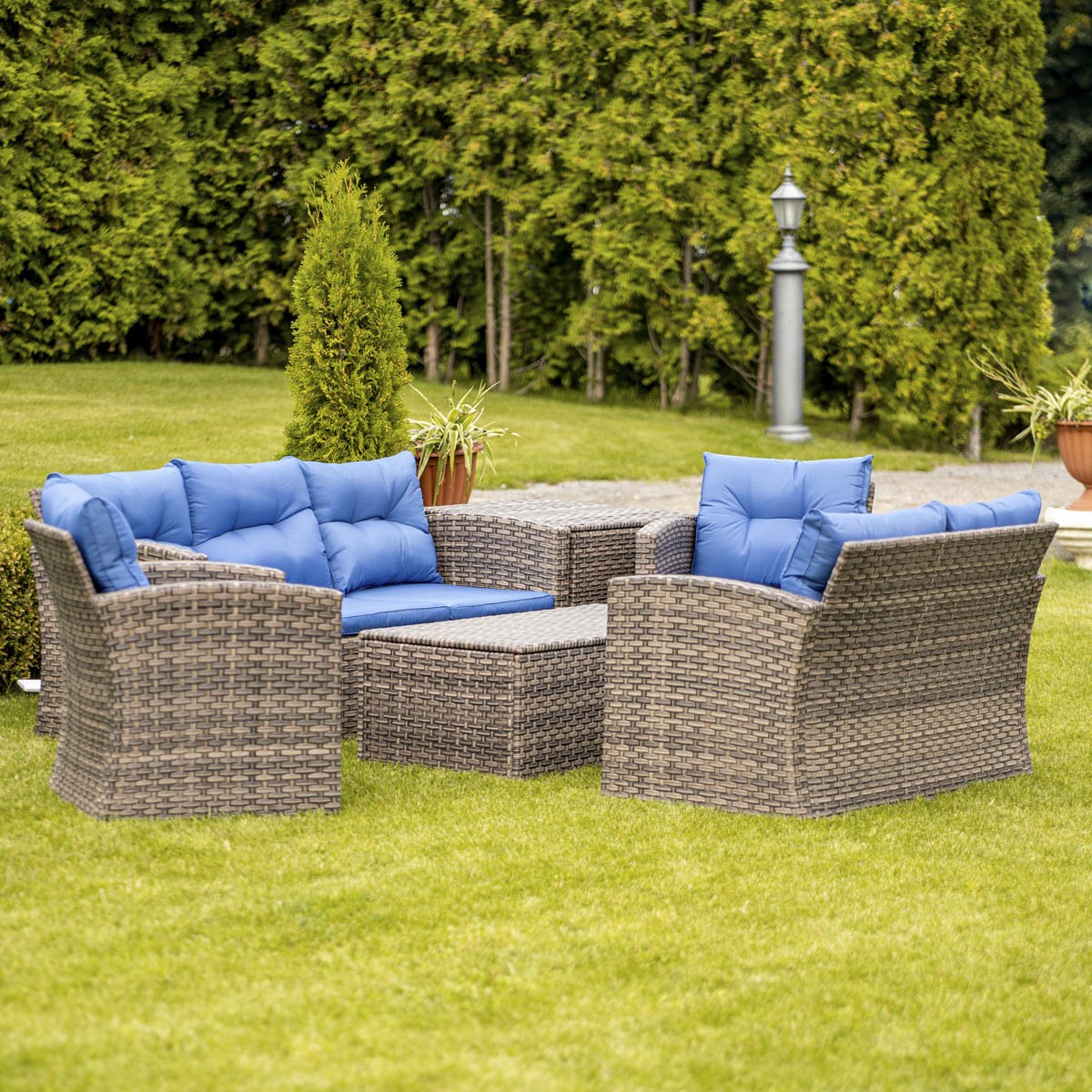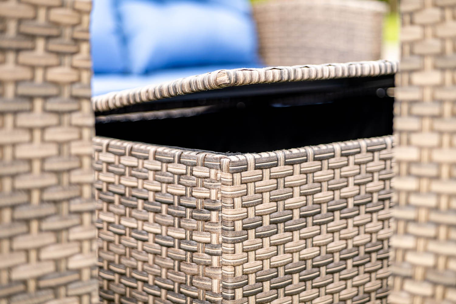 Prostoren in sodoben 6-delni vrtni set OCEAN je primeren predvsem za vrtove in prostorne terase. Set je izjemno funkcionalen, saj glavna mizica služi tudi kot shranjevalna površina za blazine, ravno tako tudi stranska mizica, kar omogoča, da bodo stvari na deževne dni na varnem. Ogrodje je jekleno.