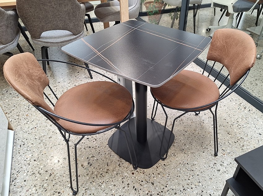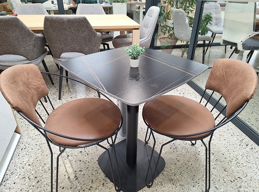 - Industrijska estetika — združevanje kovine in oblazinjenja na stolih ter črne keramike z detajli na mizi ustvarja sofisticiran, a sproščen stil.
