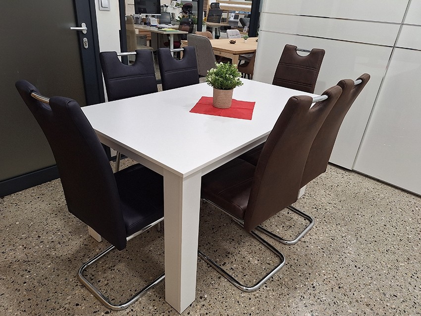 Miza KONGO s svojo čisto belo površino in trdno konstrukcijo ponuja stabilnost in enostavno vzdrževanje. Stol ROMA pa navdušuje z udobnim sediščem, mehkim oblazinjenjem in kakovostnim umetnim usnjem, ki je prijetno na otip in enostavno za čiščenje. Skupaj tvorijo idealno kombinacijo za prijetno družinsko obedovanje ali druženje s prijatelji.