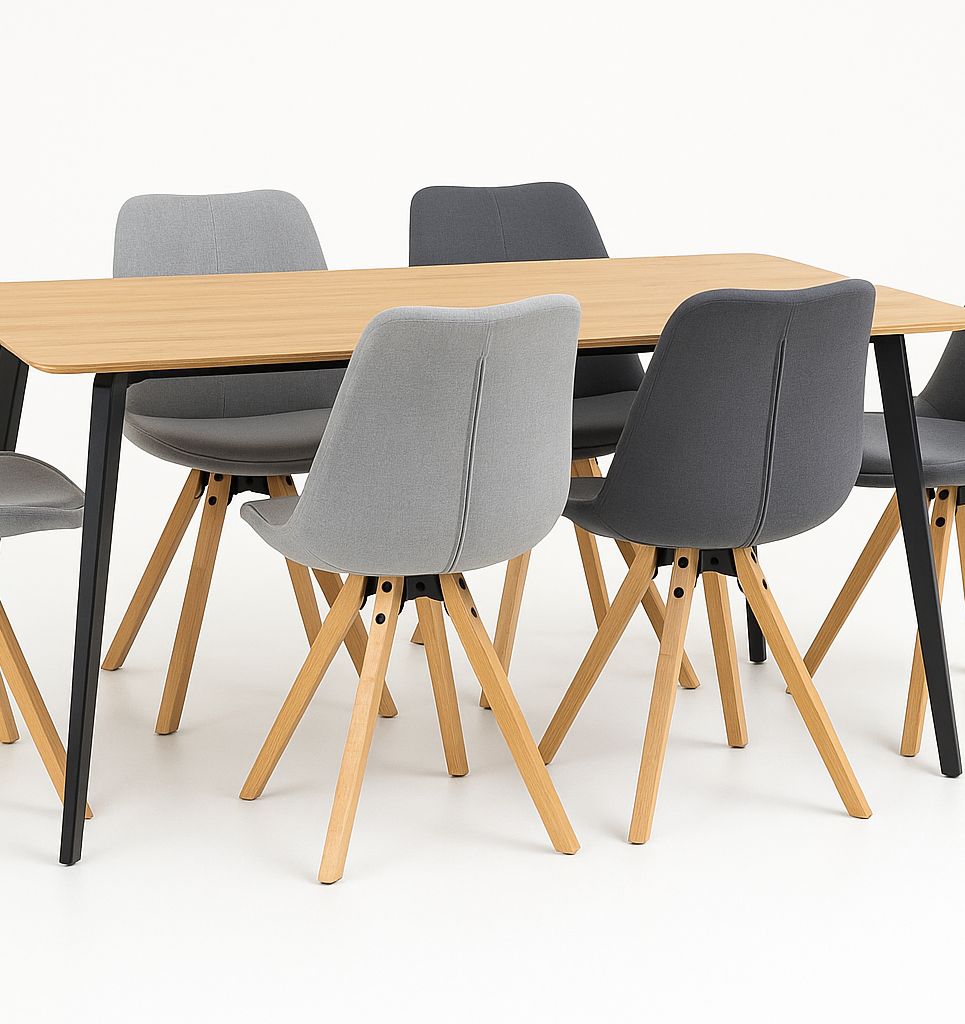 Akcijski jedilni set TRNOVO je popolna izbira za vse, ki želite v svoj dom vnesti toplino naravnih tonov in pridih sodobnega industrijskega stila. Kombinacija mize CADRO v videzu hrasta ter štirih stolov DORIAN v dveh odtenkih sive barve združuje funkcionalnost, udobje in eleganco.