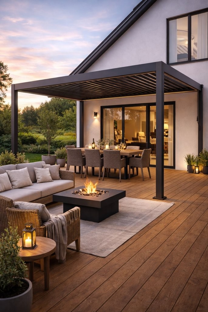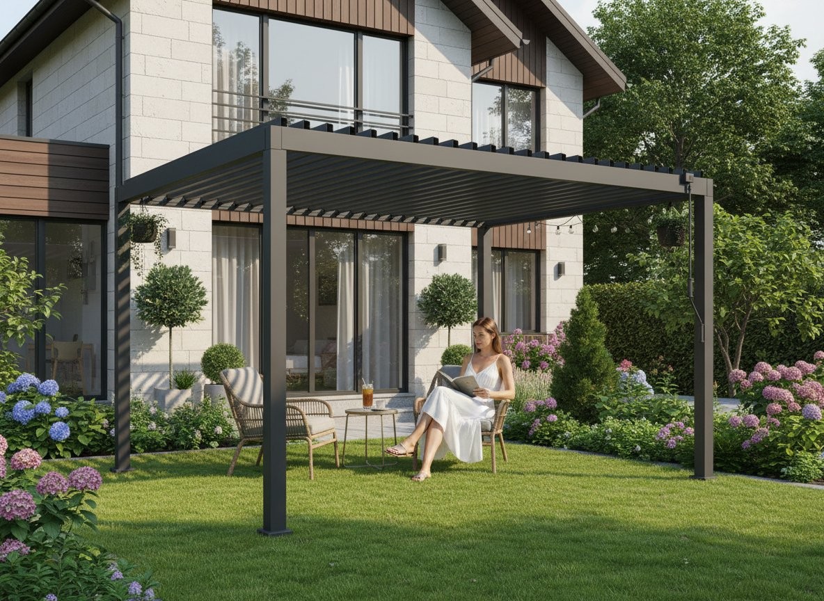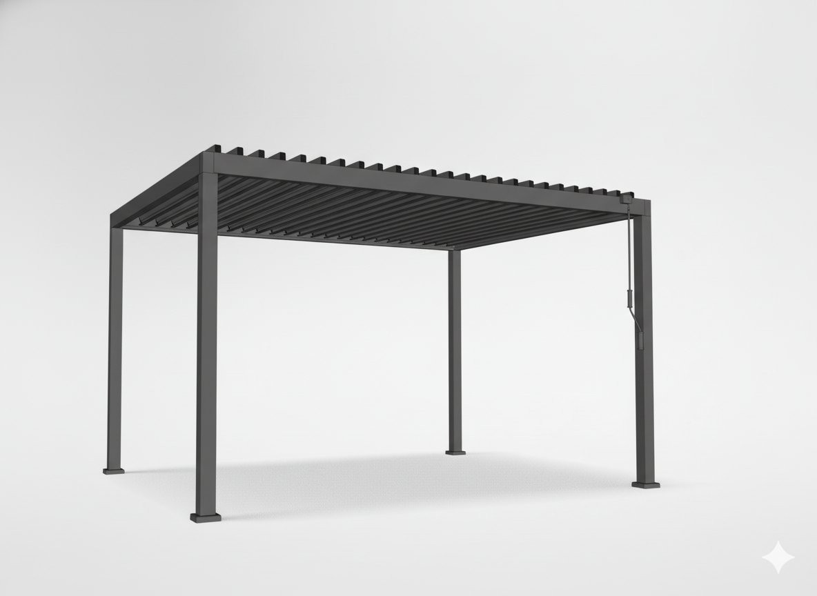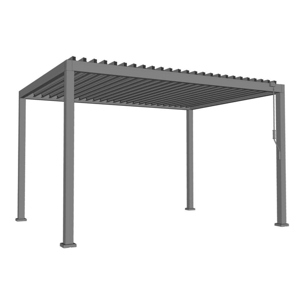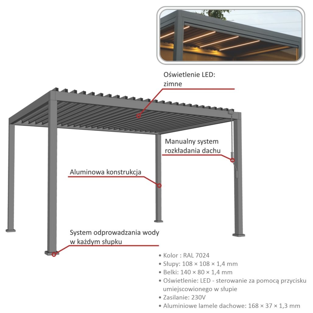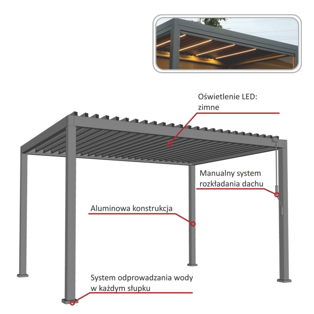 Dvojne strešne lamele pomagajo pri odvodu vode in poudarijo stabilnejšo zasnovo. Vgrajena LED osvetlitev omogoča uporabo tudi zvečer. Konstrukcija je namenjena uporabi skozi vse leto. Format 3 x 4 m ponuja večji pokrit prostor.