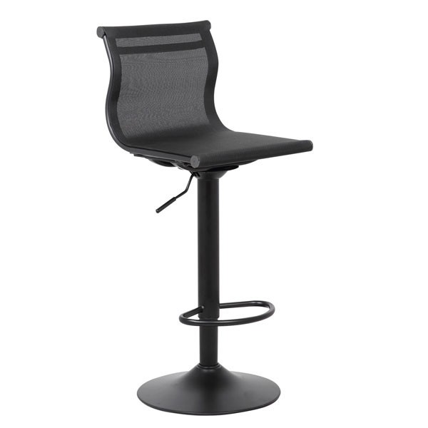 Barski stol CHAISE je moderen barski stol, ki ima hrbtišče in sedišče iz zračne ter udobne mrežne tkanine. Stol je vrtljiv in nastavljiv po višini. Podnožje je obdelano s prašnim lakiranjem v črni barvi.