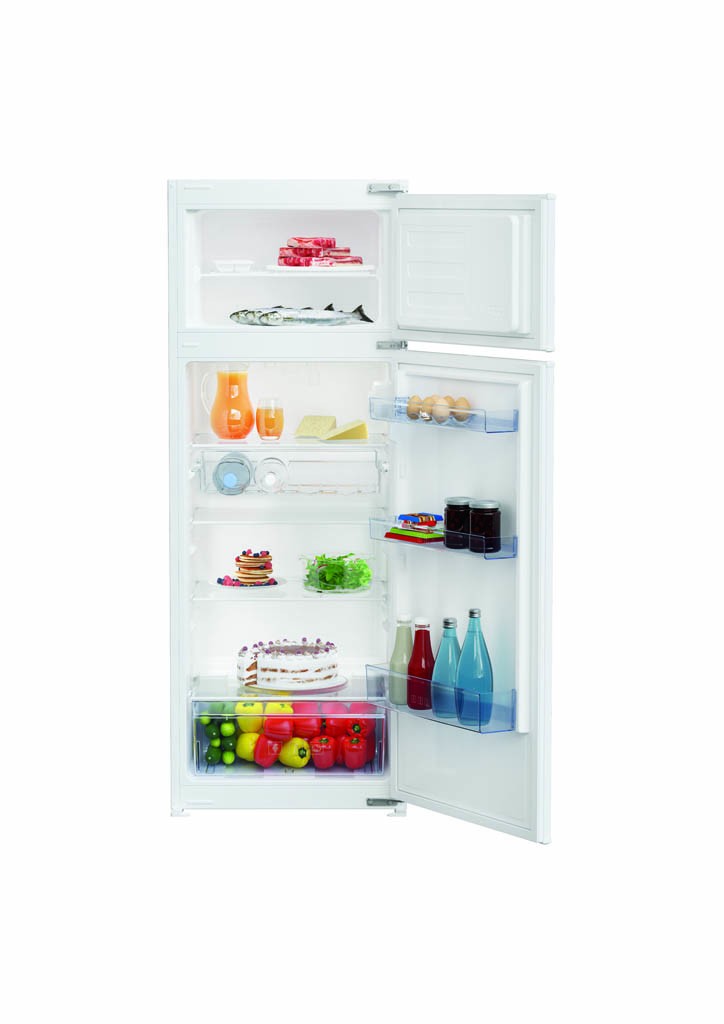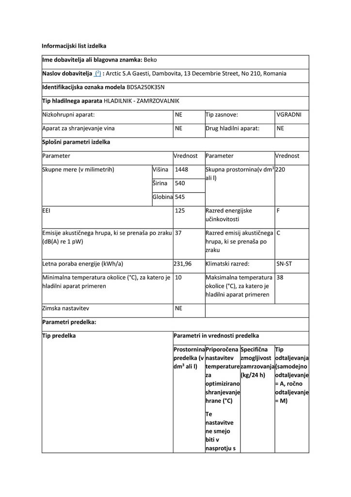 Vgradni hladilnik Beko BDSA250K3SN z zamrzovalnikom zgoraj se ponaša s štirimi steklenimi policami, tremi policami v predelu vrat, predalom za sadje in zelenjavo ter priročnim zamrzovalnikom. Nahaja se v energijskem razredu F, glasnost njegovega delovanja pa znaša 37 dB.