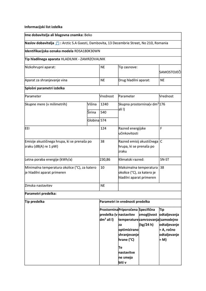 Prostostoječi hladilnik Beko RDSA180K30WN z zamrzovalnikom zgoraj je kompakten hladilnik, ki je primeren tudi za najmanjša stanovanja. S pomočjo treh po višini prilagodljivih steklenih polic, tremi policami v predelu vrat, predalom za sadje in zelenjavo ter priročnim zamrzovalnikom pa bodo vaša živila vedno skrbno in varno shranjena. Nahaja se v energetskem razredu F, glasnost njegovega delovanja pa znaša 38 dB.