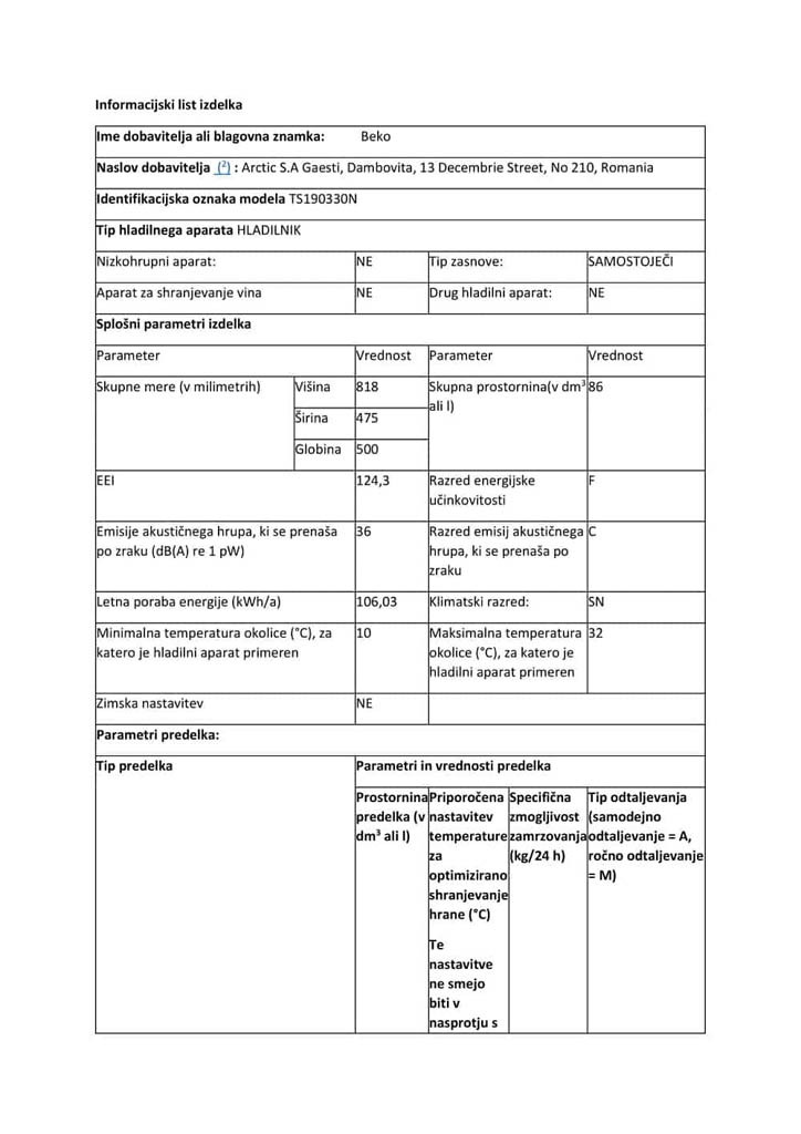 Ožji hladilnik Beko TS190330N se kljub svoji majhnosti ponaša z dvema steklenima policama, tremi pregradami čez celotno širino vrat in predalom za sadje ter zelenjavo, ki poskrbi da bodo vaša živila vedno skrbno shranjena in sveža. Z možnostjo zamenjave strani odpiranja vrat je hladilnik idealen partner manjših gospodinjstev, s svojo prostornino 86 litrov pa zagotavlja idealno in varno hrambo vaših živil. Odlikuje ga energetski razred F in glasnost delovanja 36dB.
