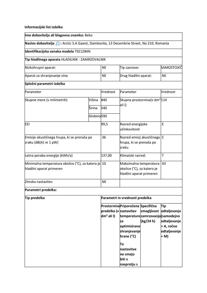 Podpultni hladilnik Beko TSE1284N kljub svoji majhnosti v sebi odklikuje 13 litrski priročni zamrzovalnik, dve stekleni polici, dve pregradi čez celotno širino vrat in predal za sadje ter zelenjavo s pomočjo katerega bodo vaša shranjena živila vedno sveža in zdrava. Z možnostjo zamenjave strani odpiranja vrat je hladilnik idealen partner manjših gospodinjstev. S svojo prostornino 101 litra hladilnega dela in zmogljivostjo zamrzovanja dveh kilogramov v 24-ih urah pa zagotavlja idealno in varno hrambo vaših živil.