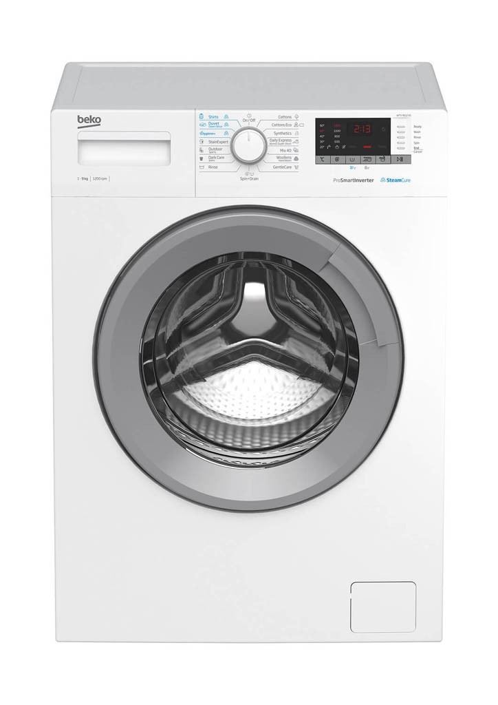 BEKO WTV9612XS pralni stroj ima kapaciteto pranja kar 9 kg in je primeren za večje družine. Invertni motor ProSmart poskrbi za tišje, dolgotrajnejše in varčnejše delovanje – saj tako stroj deluje pri energijski učinkovitosti B. Boben je narejen iz nerjavečega jekla in s tehnologijo AquaWave zagotavlja nežno pranje tudi najbolj občutljivih tkanin. Od drugih podobnih pralnih strojev se loči s parno tehnologijo SteamCure, ki pomaga odstranjevati madeže in omogoča tudi funkcijo proti mečkanju. Odlični programi so tudi Hygiene+ za popolnoma higiensko pranje tudi pri nižjih temperaturah, StainExpert za odstranjevanje medežev in program za pranje puha in posteljnine. Pralni stroj ima tudi funkcijo za naknadno dodajanje perila in certifikat za pranje volnenih oblačil Woolmark.