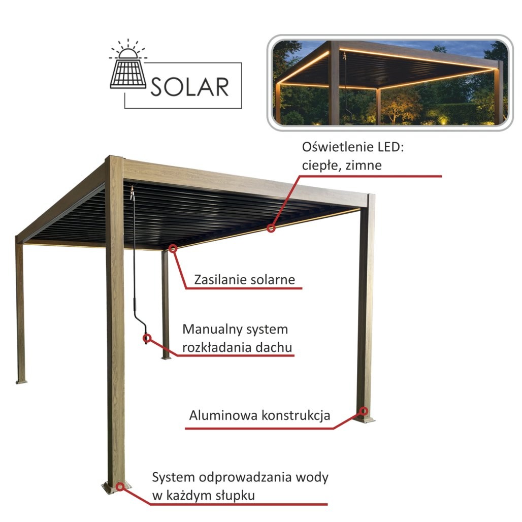 Bioklimatska pergola Jara (LED, lesni videz, 3 x 4 m) ustvari pokrito zunanjo površino z bioklimatsko zasnovo in LED osvetlitvijo. Barvna kombinacija, kot so lesni videz in temno siva, ter materiali, kot so aluminij, ustvarijo usklajen videz in podprejo praktično uporabo. Dimenzija 3 x 4 m olajša načrtovanje postavitve.
