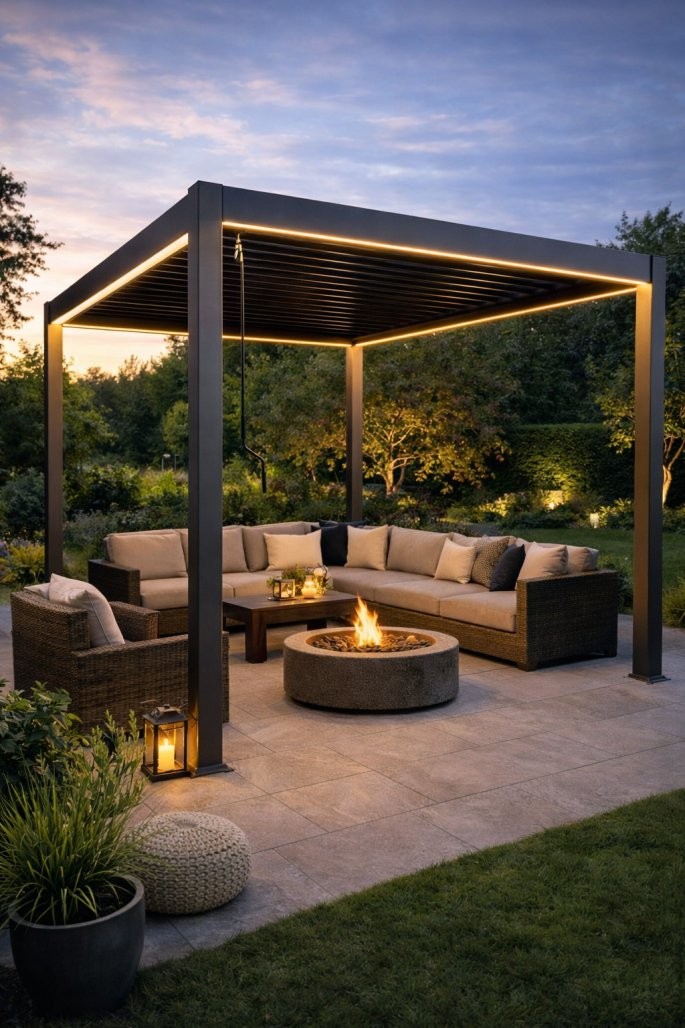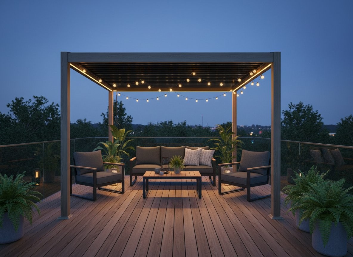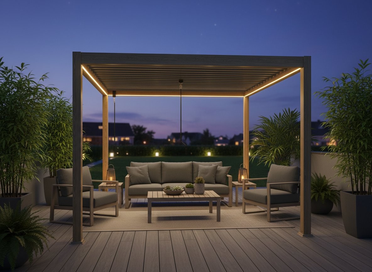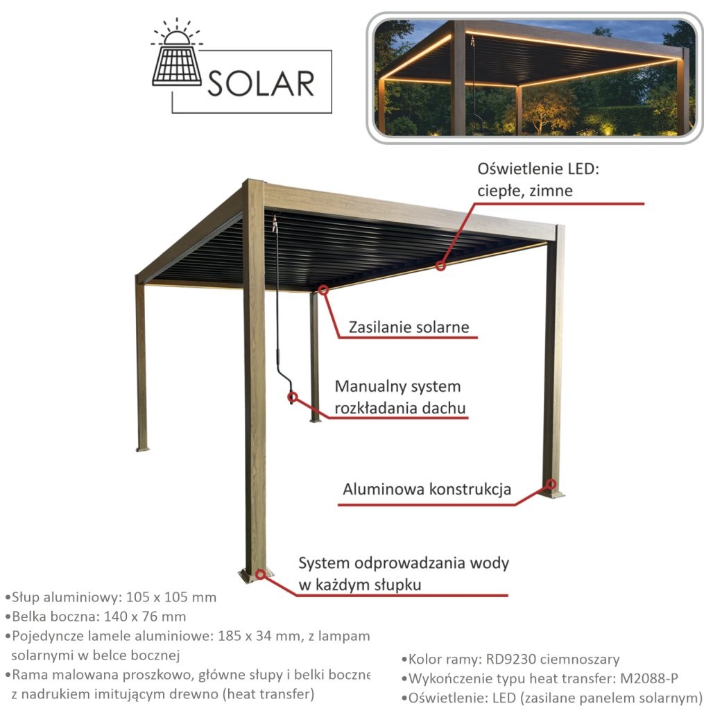 Ročno nastavljive strešne lamele omogočajo uravnavanje svetlobe in sence. Solarna LED osvetlitev v topli in hladni svetlobi dopolni uporabo po mraku. Sistem odvajanja vode je skrit v stebrih. Zaključek v videzu lesa prinaša toplejši videz sodobni konstrukciji.