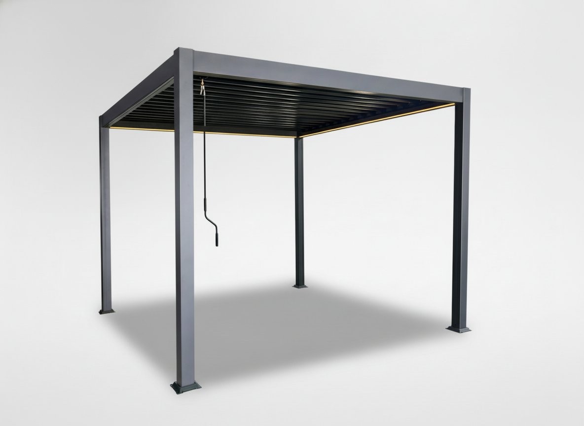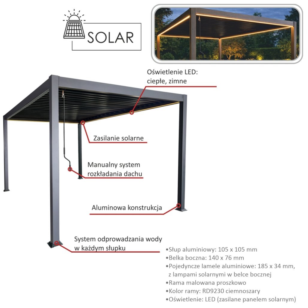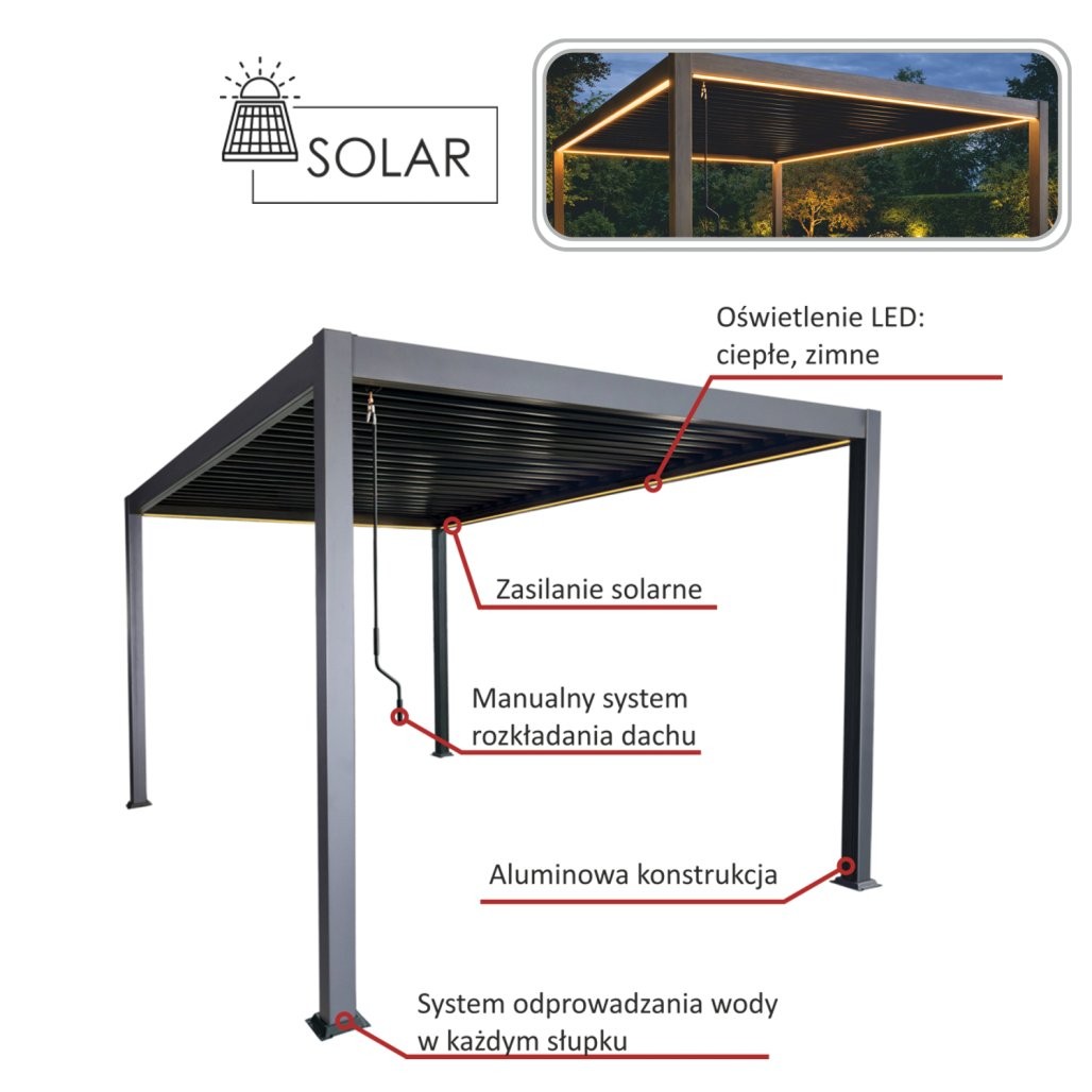 Ročno nastavljive aluminijaste lamele omogočajo uravnavanje svetlobe in zračenja. Solarna LED osvetlitev v topli in hladni svetlobi omogoča uporabo tudi po mraku. Sistem odvajanja vode je vgrajen v stebre. Prašno barvana aluminijasta konstrukcija je namenjena zunanji uporabi.