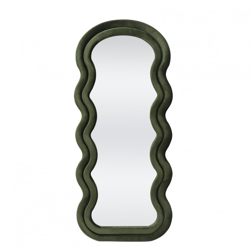 Ogledalo se ponaša z razkošnim okvirjem, ki je oblečen v žametno tkanino, kar mu daje mehko in prefinjeno teksturo, medtem ko kakovostna osnova iz MDF plošče zagotavlja trpežnost. To je ena izmed variant izdelka, ki je na voljo v več barvah, s čimer se zlahka ujema z različnimi stili notranje opreme, od klasičnega do modernega. Izbirate lahko med barvami Cimet in Olivno zelena, da popolnoma prilagodite videz vašemu ambientu.