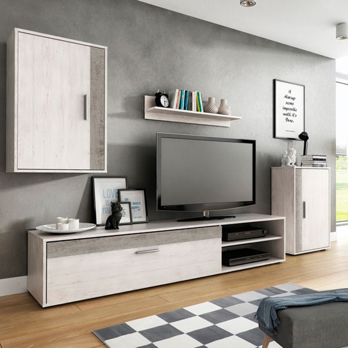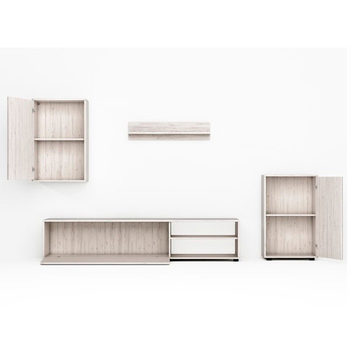 Dnevna soba ANEMOS se bo odlično podala v vsak dom in vanj eleganco. Dnevni sestav vsebuje regal za TV, dve manjši omarici (talna in stenska) ter polico.