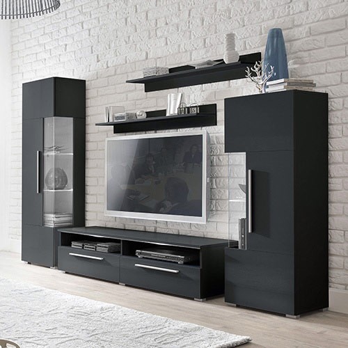 Atraktivna dnevna soba Coco preprostih modernih linij črne barve z vrati v črni barvi visokega sijaja. Funkcionalen dizajn nadgarjujeta 2 stekleni vitrini. Skupaj s kvalitetno izdelavo pa je zadovoljstvo garantirano.