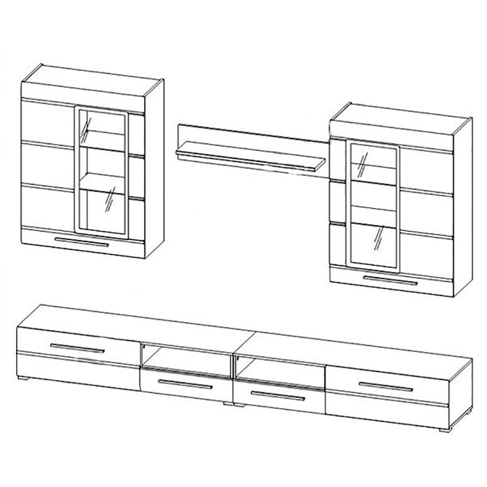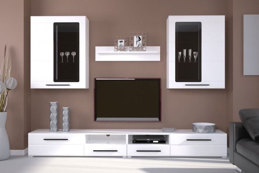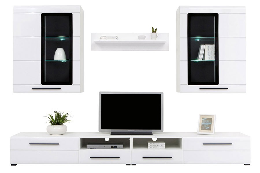 Dnevna soba GUS moderno bivanje združuje s priročnostjo in elegantnimi podrobnostmi. Trendovska oblika je popolna izbira za opremitev vašega doma. Polica se pritrdi neposredno na steno. Bele svetleče fronte poudarjajo edinstven značaj pohištva in vizualno povečajo prostor. Osvetlitev ustvarja edinstveno vzdušje v dnevni sobi. Vse površine so vodoodporne in enostavne za čiščenje. Dnevna soba GUS je idealna za sodobno opremljene apartmaje. LED osvetlitev se nahaja v vitrinah.