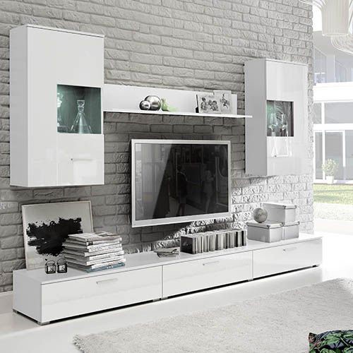 Moderen regal Hugo 10 v barvni kombinaciji bele (struktura) in bele visokega sijaja (vrata regala) ter manjšimi steklenimi vitrinami.. Elegantna in funkcionalna dnevna soba Hugo 10 je odlična izbira za sodobno domovanje.
