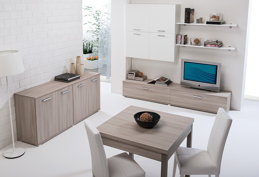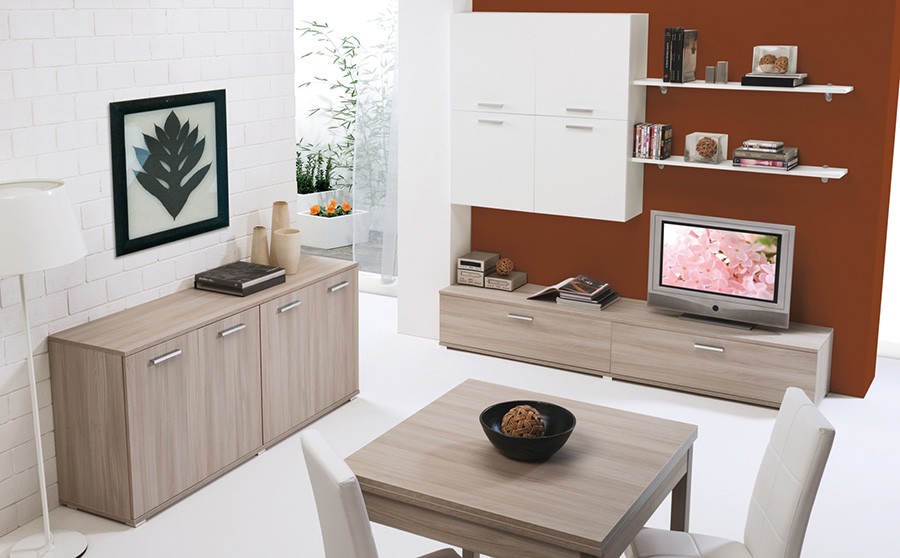 Dnevna soba je narejena iz oplemenitene iverne plošče v kombinciji dveh barv. Set dnevne sobe je na voljo v dveh sestavih in sicer kot mali set ali veliki set.