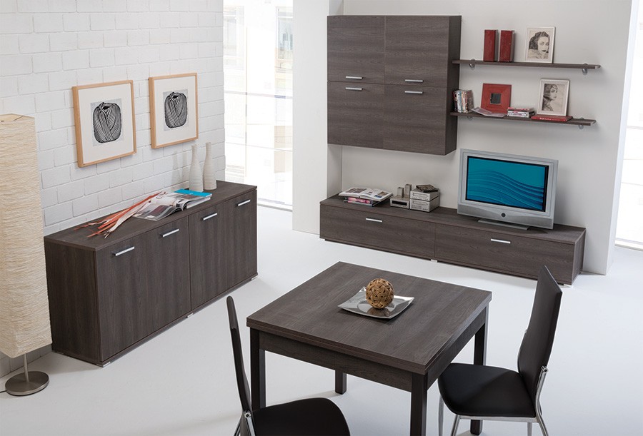 Dnevna soba je narejena iz oplemenitene iverne plošče v temno sivi barvi. Set dnevne sobe je na voljo v dveh sestavih in sicer kot mali set ali veliki set.