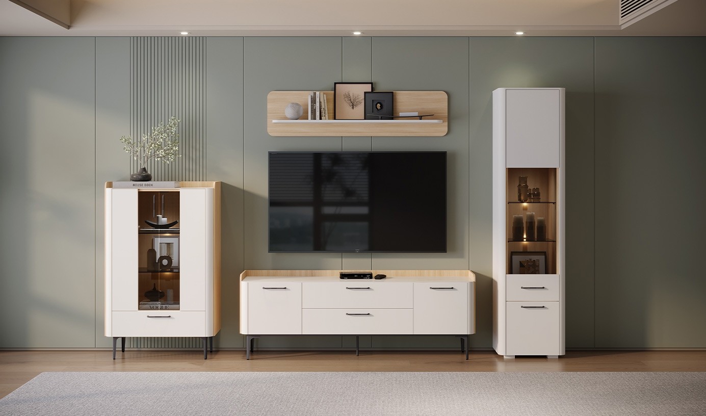 DNEVNA SOBA RADDA AIR 1 Z LED OSVETLITVIJO v vaš dom vnese svežino, sodoben dizajn in naravno harmonijo. Ta dnevna soba izžareva lahkotnost in eleganco, vsak element je skrbno zasnovan, da zagotavlja popolno ravnovesje med funkcionalnostjo in dolgotrajnostjo. Set vključuje prostorno TV omarico, dve vitrini ter dekorativno visečo polico, vključena je pa tudi LED osvetlitev, ki še dodatno izboljša videz dnevne sobe.