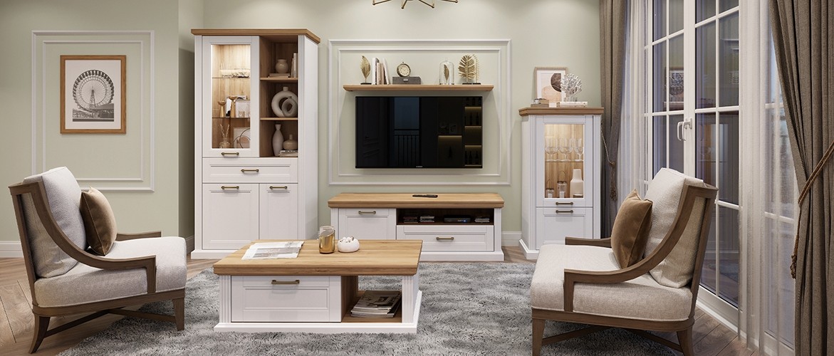 Vam je všeč klasičen stil pohištva, ki v domu ustvari občutek prefinjenosti in elegance? Potem je dnevna soba RADDA TARA prava izbira za vas! Vključuje dve vitrini, Tv omarico, stensko polico in klubsko mizico tako da je izjemno funkcionalna in vam nudi obilo prostora za shranjevanje. Vsi predali in vratca imajo funkcijo tihega zapiranja, ki pripomore k lažji vsakodnevni uporabi in prepreči prehitro obrabo pohištva, zato bo dnevna soba dolgo časa izgledala odlično.