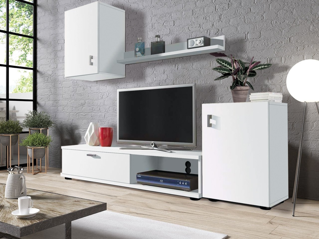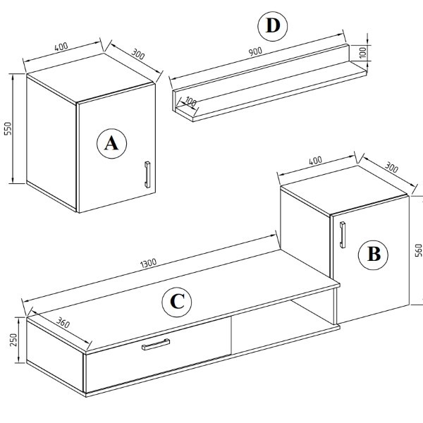 V sestavu prejmete: polico, visečo omarico, TV regal in spodnjo omarico. Maksimalna nosilnost TV omarice je 20 kg.