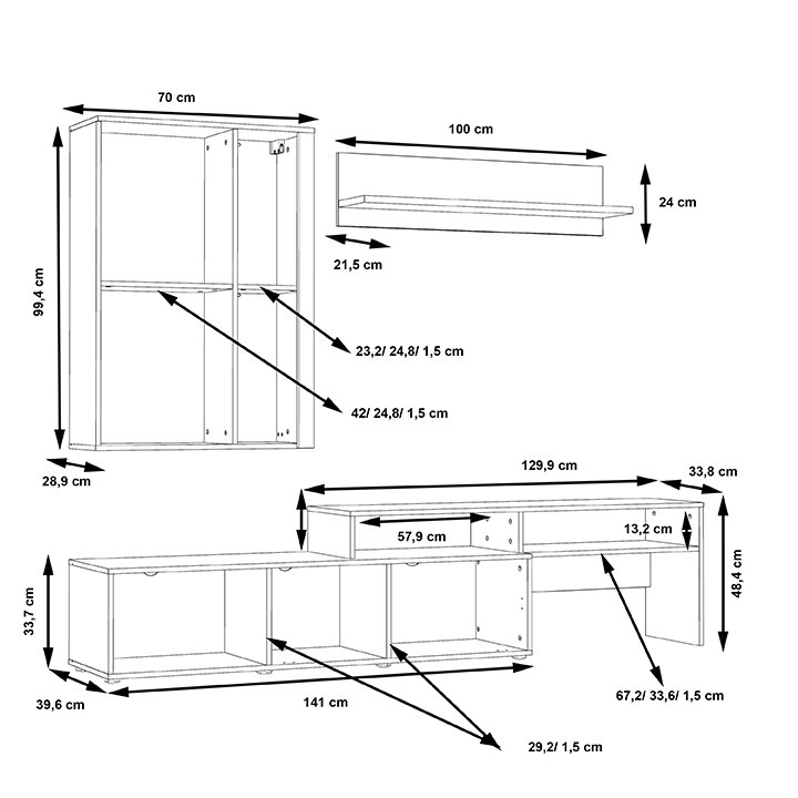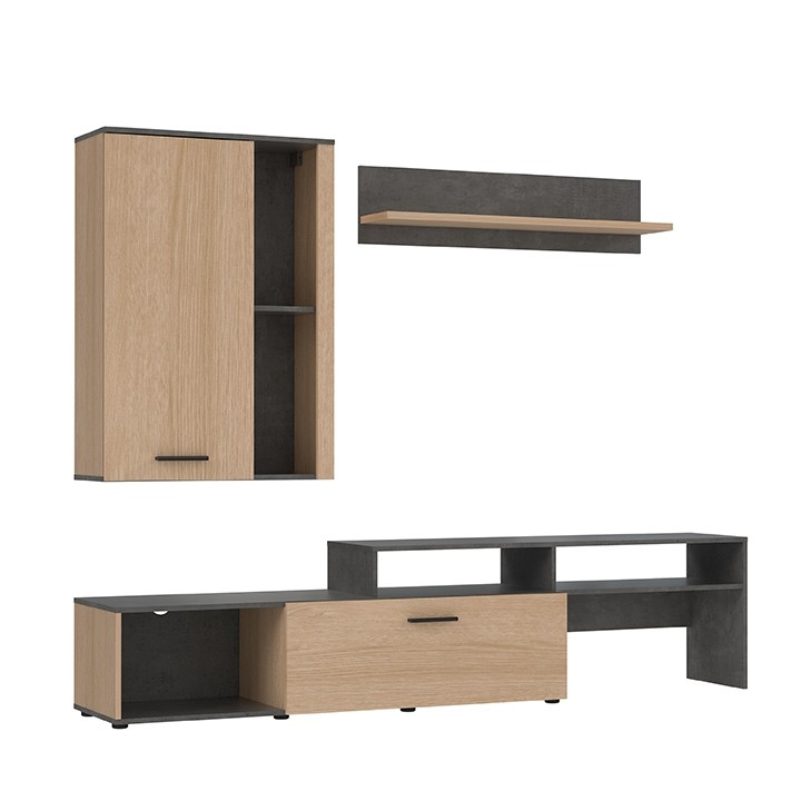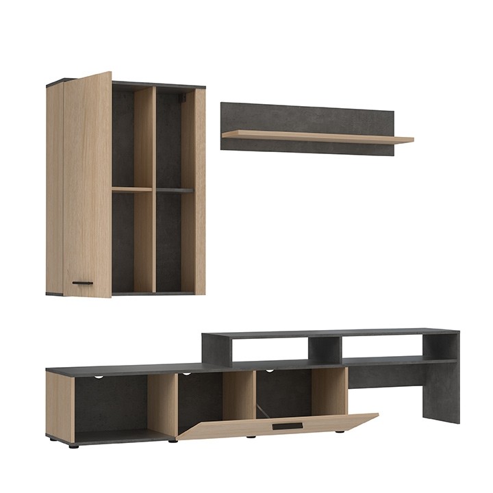 Set je sestavljen iz TV omarica, odprte police in viseče omarice. Možen je tudi dokup LED osvetlitve, ki še dodatno izboljša videz dnevnega regala ter dodatno izpostavi dekorativne predmete, katere imate razstavljene na policah.
