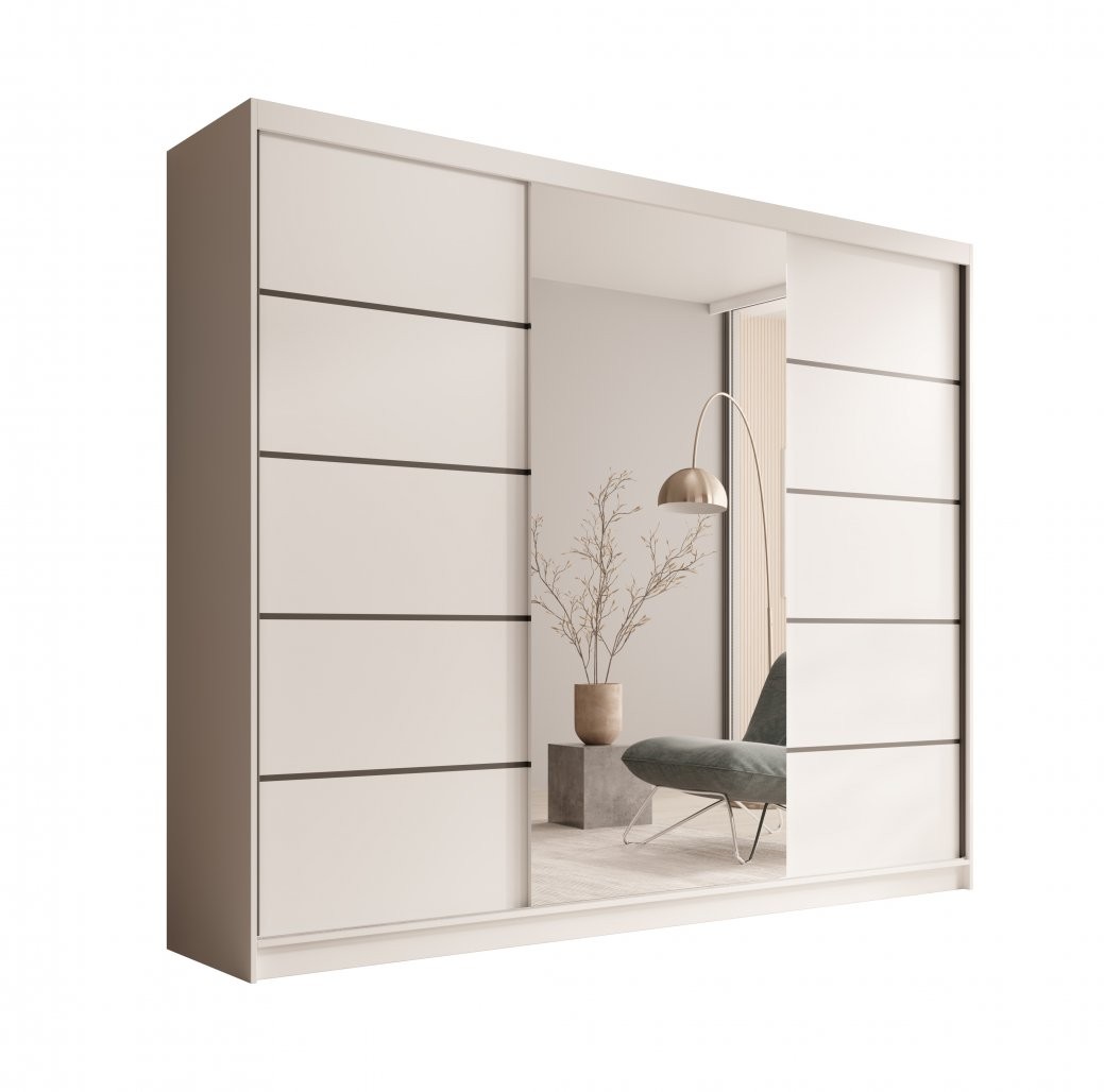 Drsna garderobna omara Etna 250 z ogledalom (bela) je sodobna in prostorna rešitev za vašo spalnico ali garderobo. Njena elegantna oblika in velika ogledala na sprednjih vratih optično povečajo prostor in prispevajo k svetlejšemu videzu sobe.
