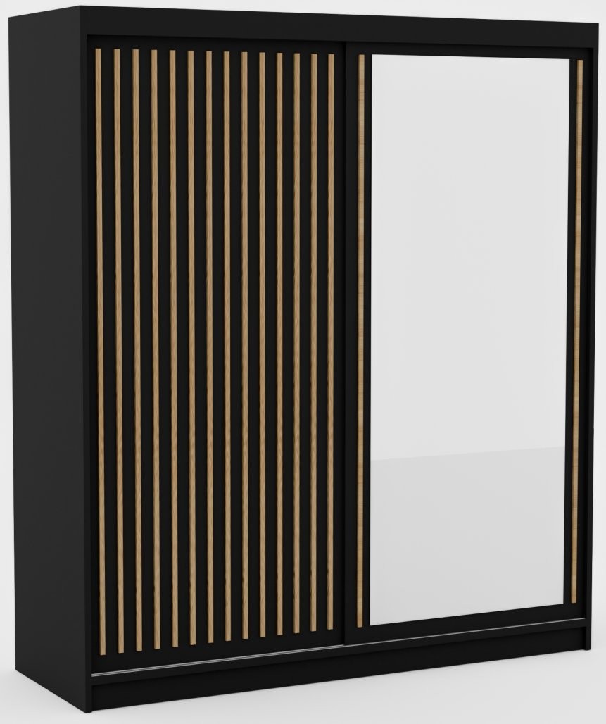 Drsna omara Delia z lesenimi lamelami 180 cm (črna/hrast) je popolna izbira za vse, ki iščejo funkcionalno in estetsko dovršeno rešitev za shranjevanje. S svojo elegantno zasnovo in toplimi lesnimi odtenki se enostavno prilega različnim notranjim slogom.