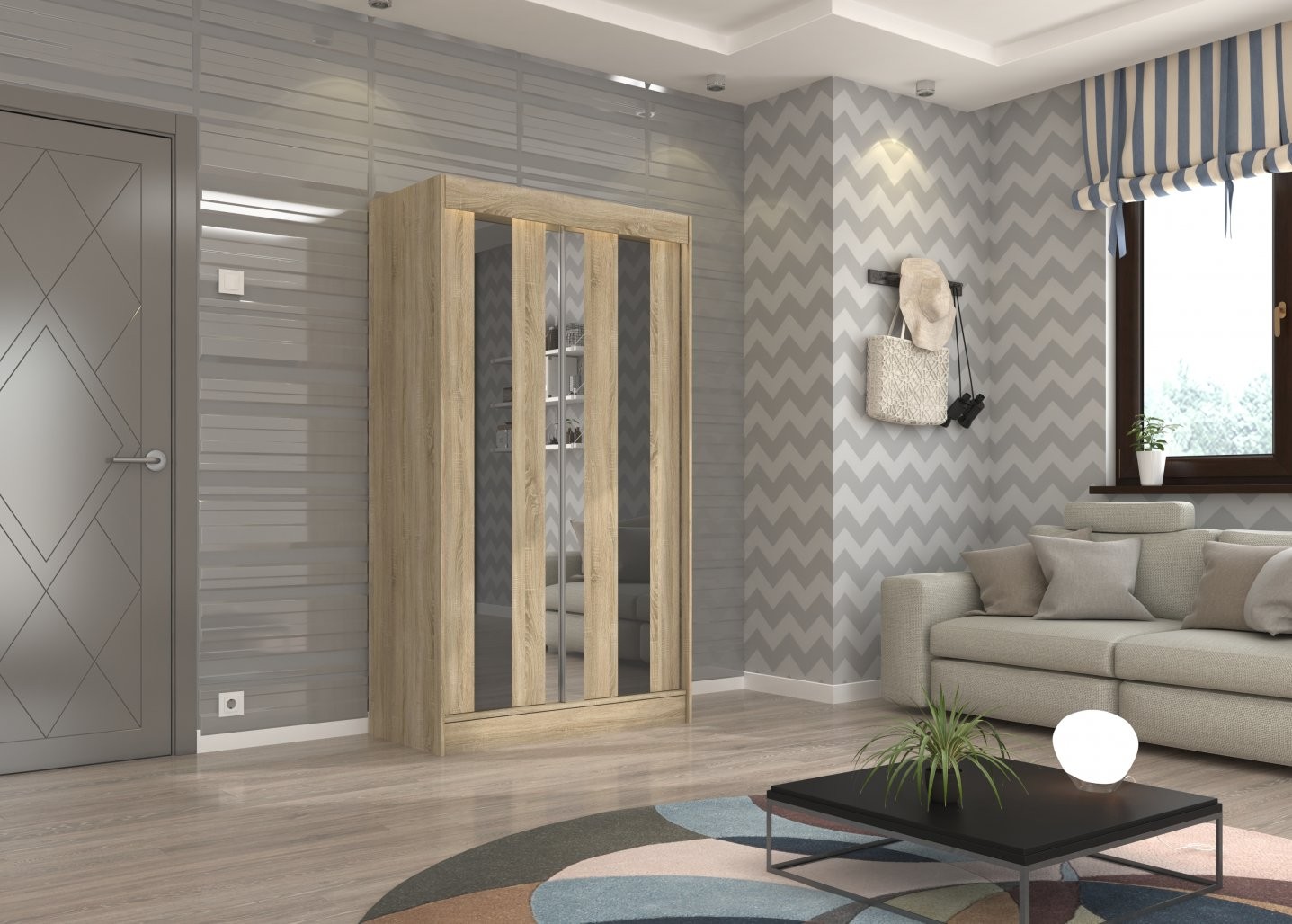 Drsna omara KEITA z ogledalom in lacobelom je elegantna in funkcionalna rešitev za shranjevanje, primerna za sodobne domove. Zaradi drsnih vrat je idealna izbira za manjše prostore, kjer želite prihraniti prostor.