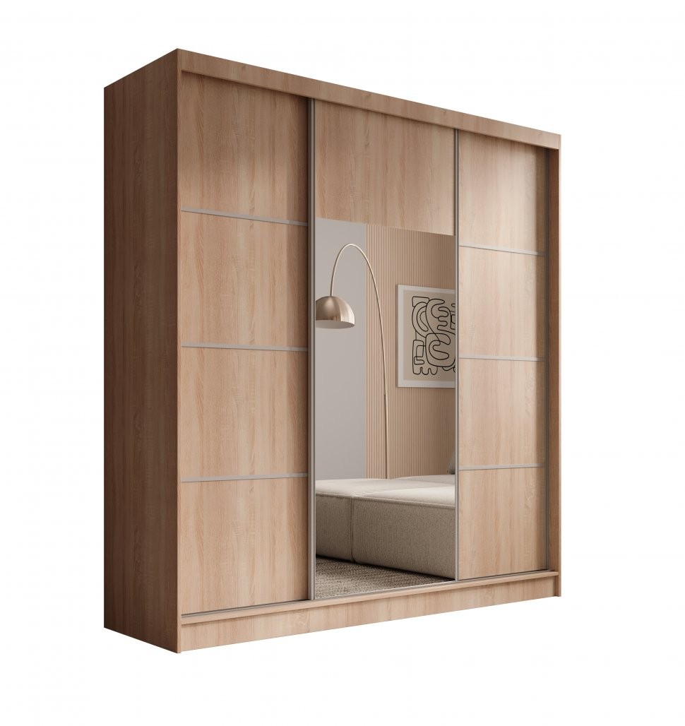 Drsna omara Keri 200 s tremi vrati in ogledalom je elegantna in prostorna rešitev za urejen dom, primerna za spalnice, hodnike ali garderobe.