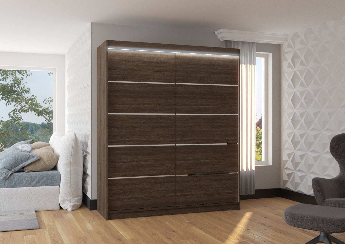 Drsna omara SPECTRA 180 z LED osvetlitvijo je popolna izbira za vse, ki iščejo funkcionalno in estetsko dovršeno rešitev za shranjevanje oblačil in dodatkov. S svojo sodobno zasnovo in elegantnimi srebrnimi črtami na sprednji strani doda prostoru edinstven slog.