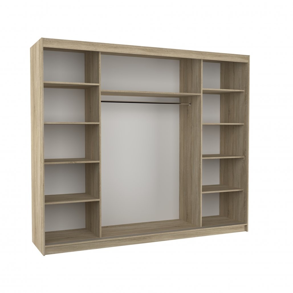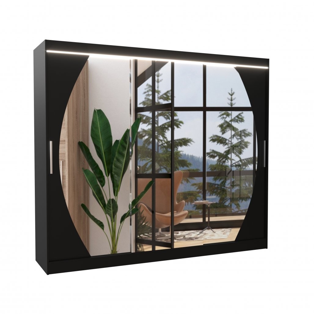 Drsna omara z ogledalom CAMBE 250 cm (črna) je popolna rešitev za urejeno in funkcionalno shranjevanje v vašem domu. Zaradi premičnih vrat in vgrajenih ogledal je idealna izbira za manjše prostore, saj optično poveča prostor in ne potrebuje dodatnega prostora za odpiranje vrat.