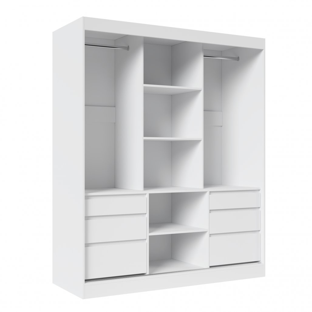 Ker ima omara drsna vrata, ne zavzema dodatnega prostora pri odpiranju, kar je idealno za manjše prostore. Prostorne police, predali in obešalni drogovi omogočajo optimalno organizacijo oblačil in dodatkov.