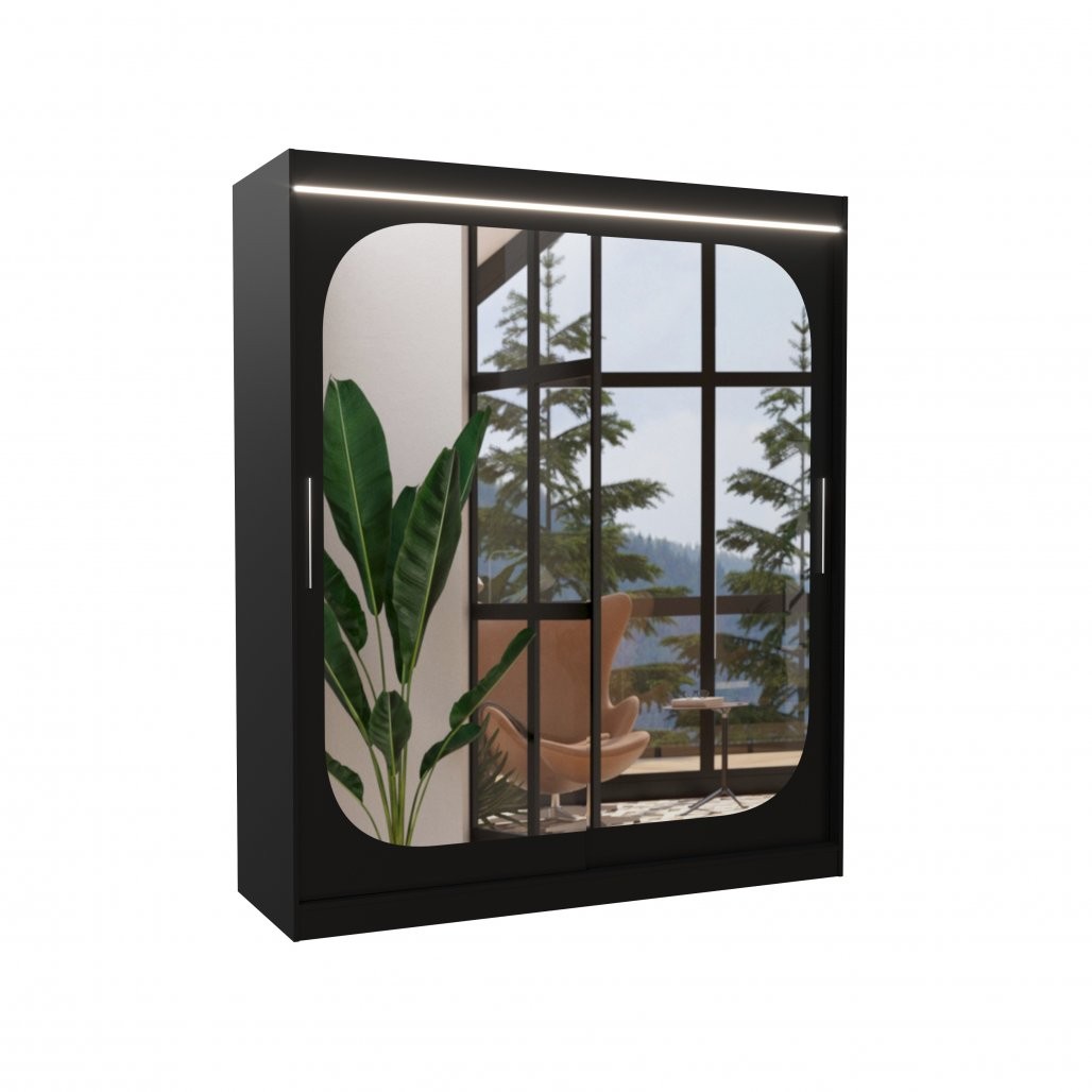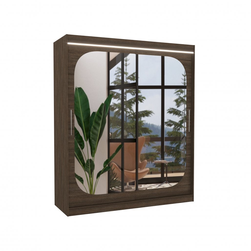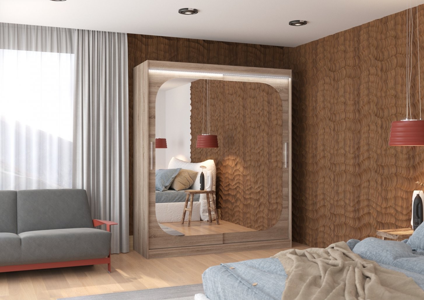 Sprednja ogledala optično povečajo prostor, medtem ko LED osvetlitev doda pridih elegance in topline. Zaradi drsnih vrat je omara idealna za ozke prostore, kjer je vsak centimeter dragocen.
