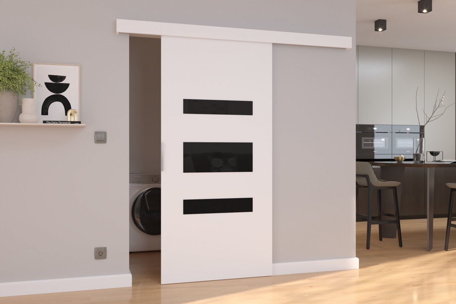 Drsna stenska vrata DESIO so idealna rešitev za sodobne domove, kjer je pomembna optimalna izraba prostora in estetski videz. Z univerzalno montažo (levo ali desno) in elegantnim dizajnom z vložki iz sijajnega lakobela, ustvarjajo občutek večjega prostora in sodobne elegance.