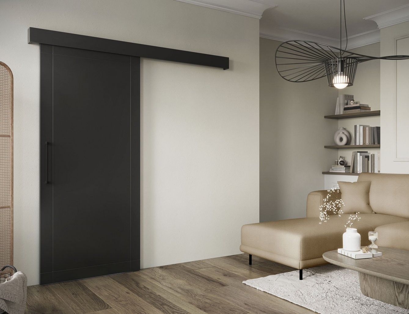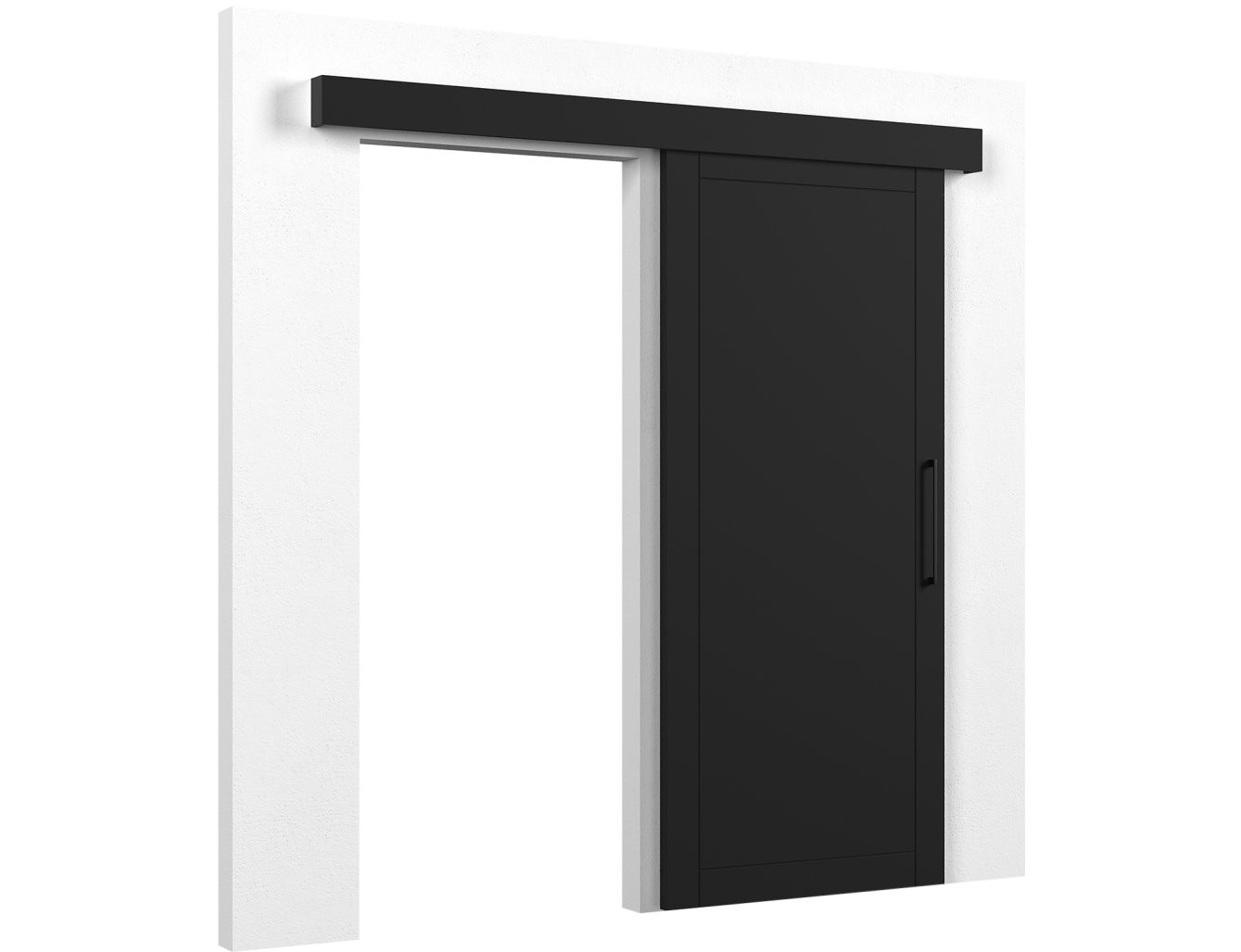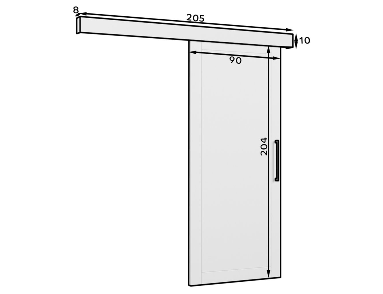Vrata so izdelana iz laminirane pohištvene plošče in so zasnovana tako, da se prilegajo standardnim odprtinam za vrata, saj merijo 90 cm v širino in 204 cm v višino. Opremljena so z mehanizmom Laguna STANDARD 1990 s 195 cm vodilno tirnico, ki omogoča gladko in tiho drsenje. Komplet vključuje tudi pokrov iz laminirane pohištvene plošče in črn plastični ročaj.