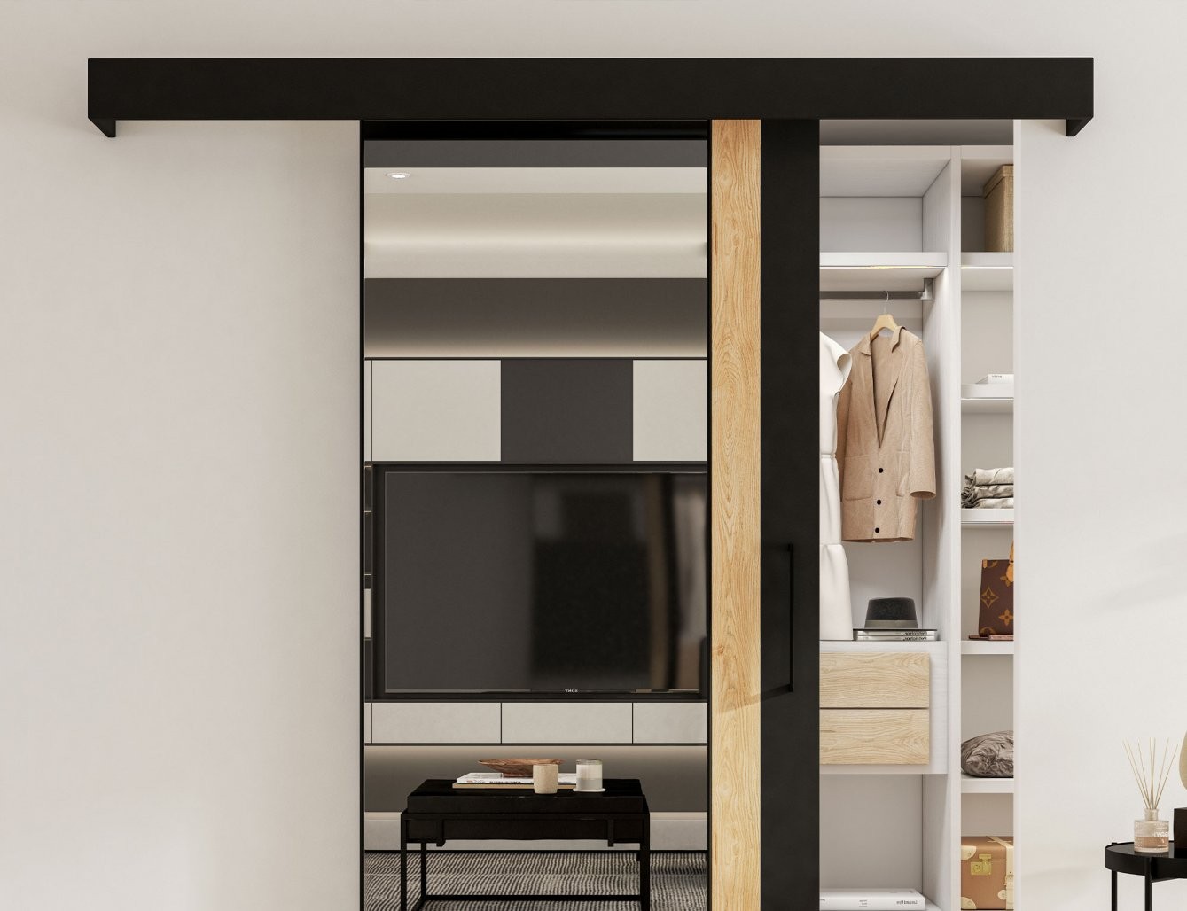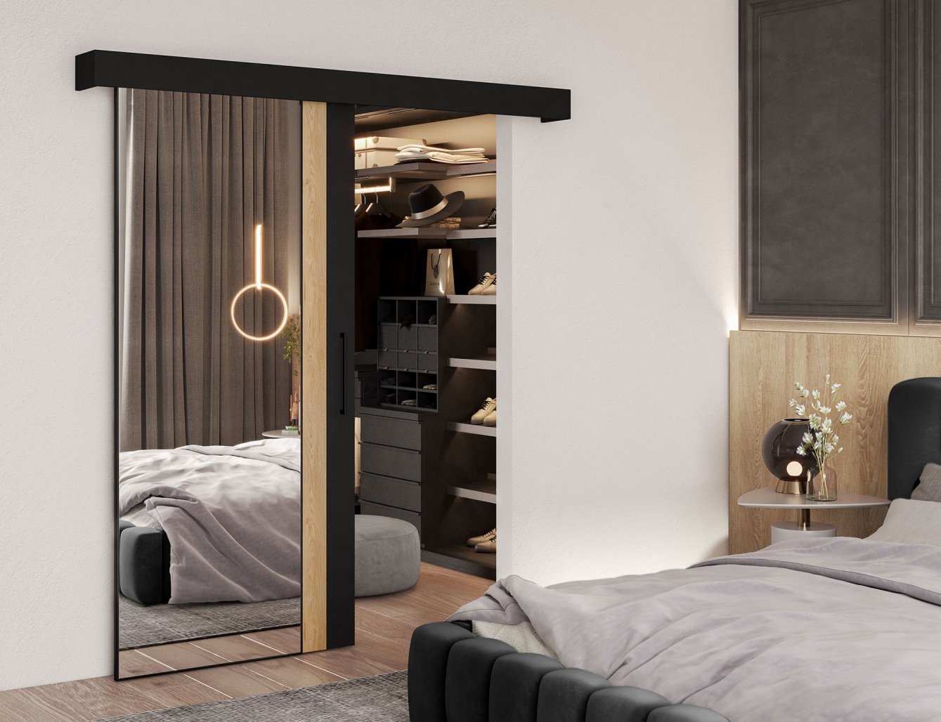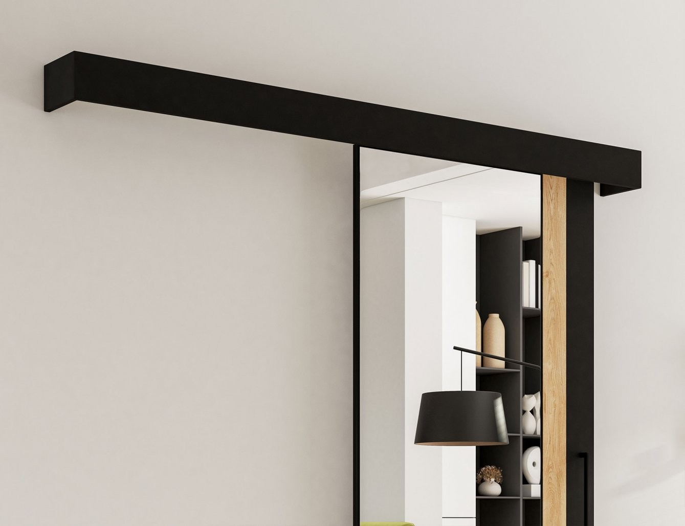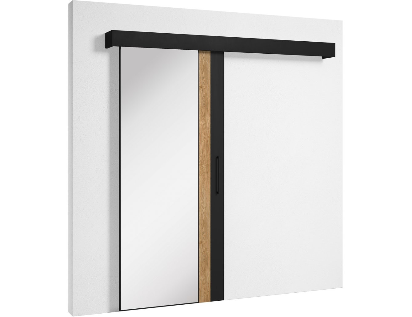 Ta vrata so izdelana iz vzdržljivih materialov: laminirane pohištvene plošče in plastike, kar zagotavlja dolgo življenjsko dobo. Opremljena so z mehkim zapiranjem in sistemom Laguna S100, kar omogoča gladko in tiho premikanje vrat. V kompletu je tudi eleganten črn ročaj, ki poudarja estetiko vrat, ter pokrov za vodilo, ki zagotavlja čist videz.