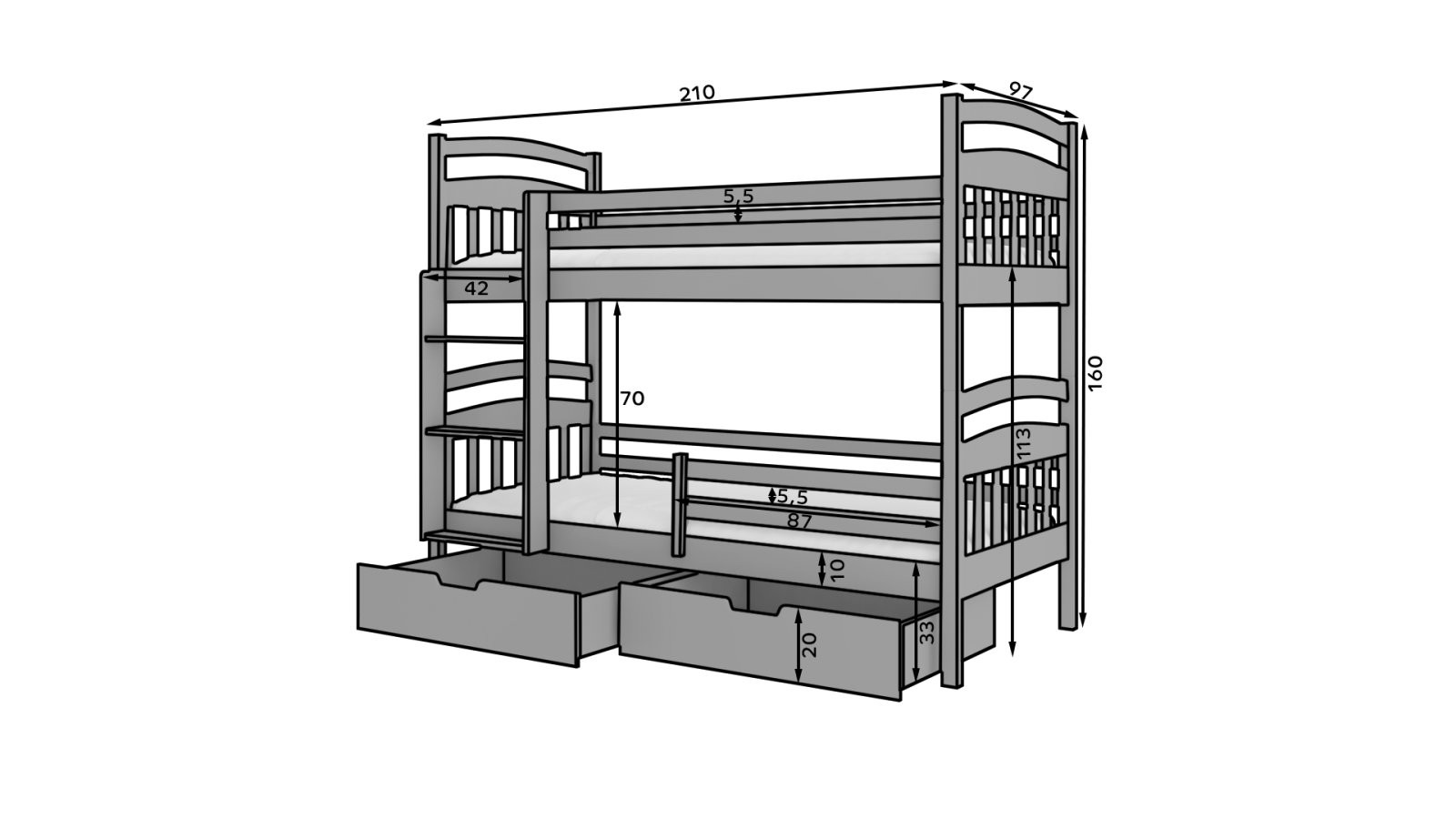 Dvoposteljni pograd ADA je idealna rešitev za prihranek prostora v otroški sobi, ne da bi pri tem žrtvovali udobje ali funkcionalnost. Sodobna zasnova in več barvnih možnosti omogočajo, da se popolnoma ujema z različnimi stili notranje opreme.