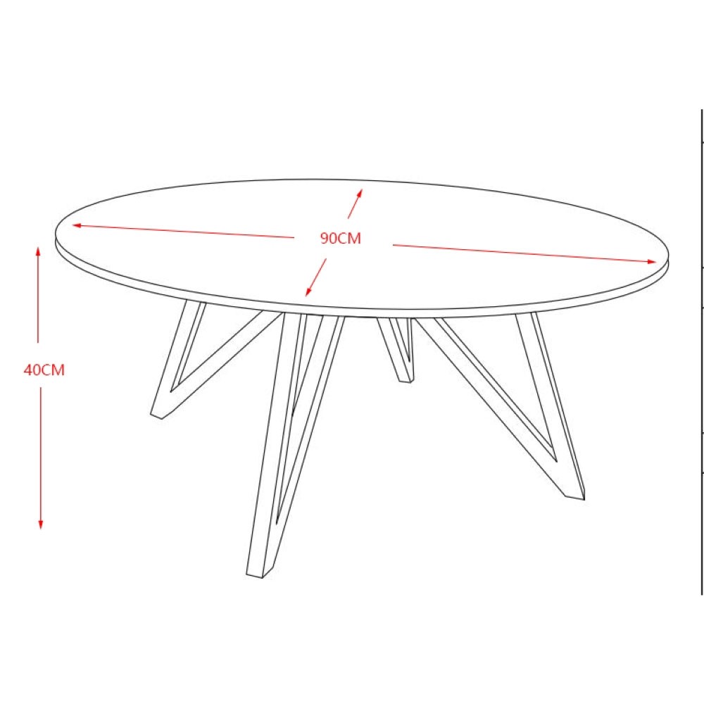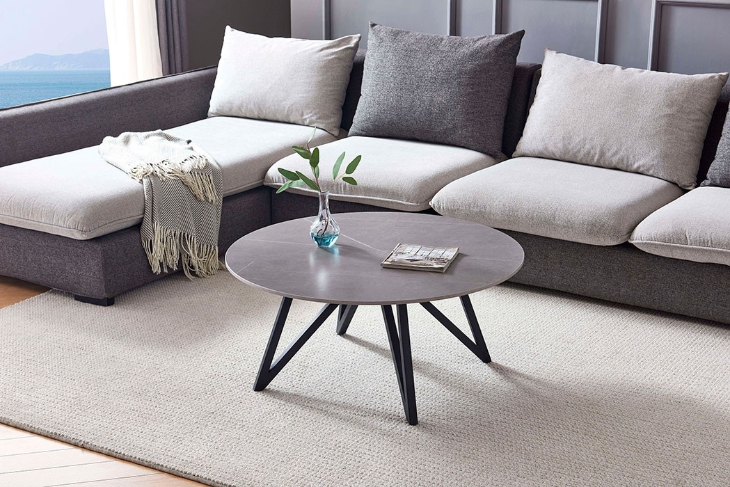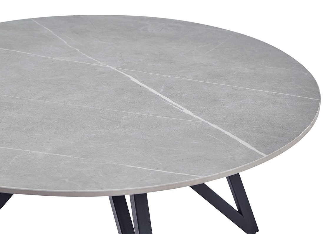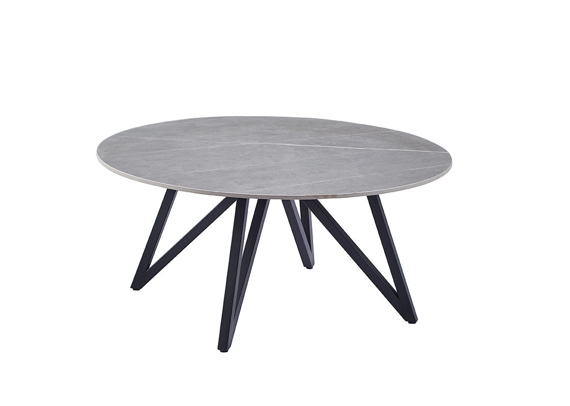 Nizka klubska mizica okrogle oblike se s svojim modernim dizajnom in barvo odlično poda v vsako dnevno sobo. Namizna plošča je izdelana iz sintranega kamna, ki ga okrašuje z vzorcem sivega marmorja. Miza je težko lomljiva in odporna na vročino in mraz, kar je še dodatna prednost, da ta miza pride v vaš dnevni prostor. Podpora namizni plošči je narejena iz MDF materiala, medtem ko so nogice narejene iz kovine in lakirane za boljšo zaščito. Maksimalna obremenitev je 120 kg.
