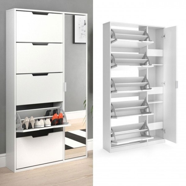 Omara za čevlje ONEL 6 je praktična omara za čevlje, ki je dobavljiva v beli barvi. Omara je narejena iz oplemenitene iverne plošče. Omara ima na levi strani 5 predalov za čevlje. Vsak predal ima vmesno pregrado, ki jo lahko uporabite po potrebi. Na desni strani je omara z ogledalom na zunanji strani in policami v notranjosti. Oglejte si še druge omare za čevlje iz istega programa.