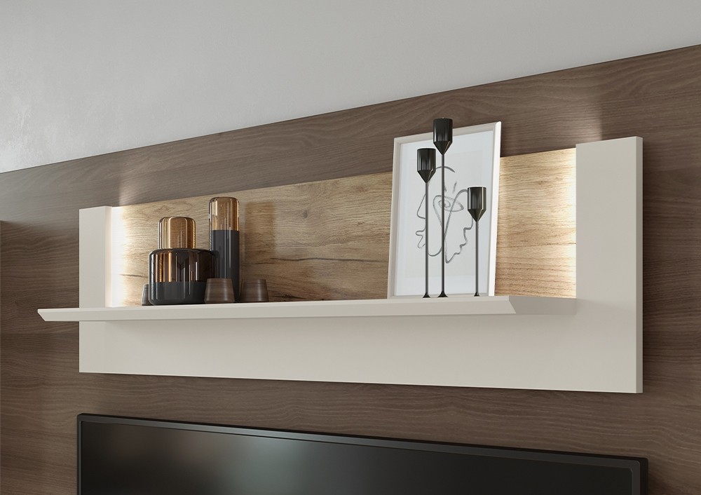 Stenska polica SKY 45 - 116 CM je na voljo v čudoviti kombinaciji hrasta in kašmir mat lak barve. Polica vam bo služila kot odlagalni kotiček za vse manjše predmete in spominke, ki jih želite razstaviti, da so vsem na očeh.