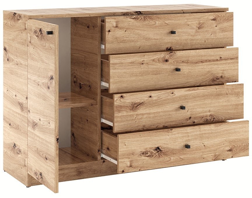 Komoda je na voljo v barvni kombinaciji hrast Artisan/hrast in je odlična izbira za spalnice ali dnevne sobe, kjer potrebujete dodatni prostor za shranjevanje s stilom.