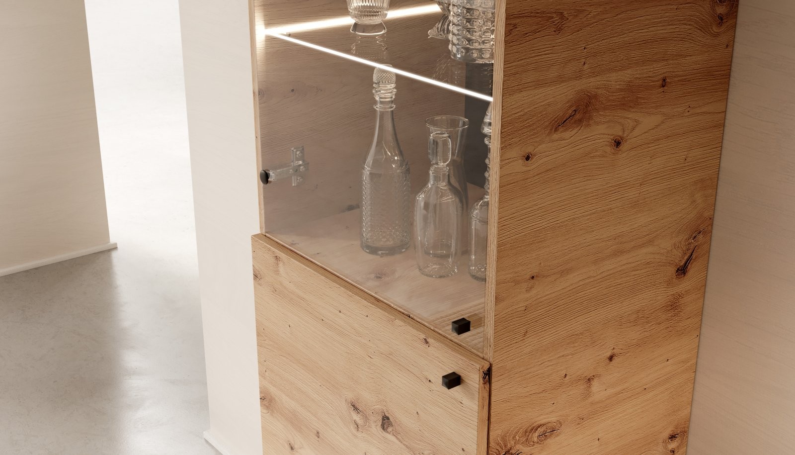 Elegantna vitrina Evi II z LED osvetlitvijo je popolna izbira za vse, ki iščejo funkcionalen in estetsko dovršen kos pohištva. S svojo zasteklitvijo in obrtniško barvo doda prostoru sodoben in prefinjen videz, ki se odlično ujema z različnimi interierji.