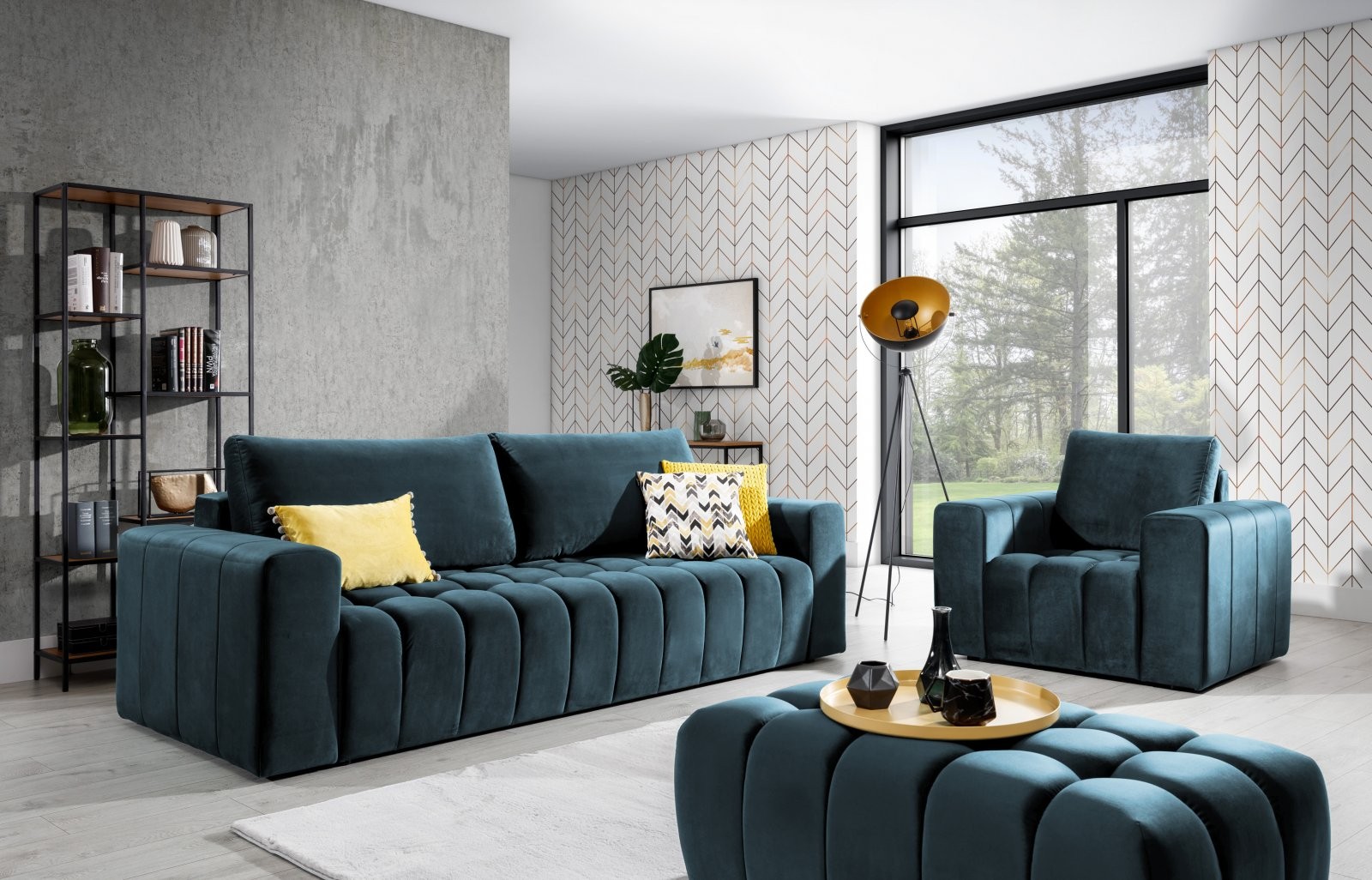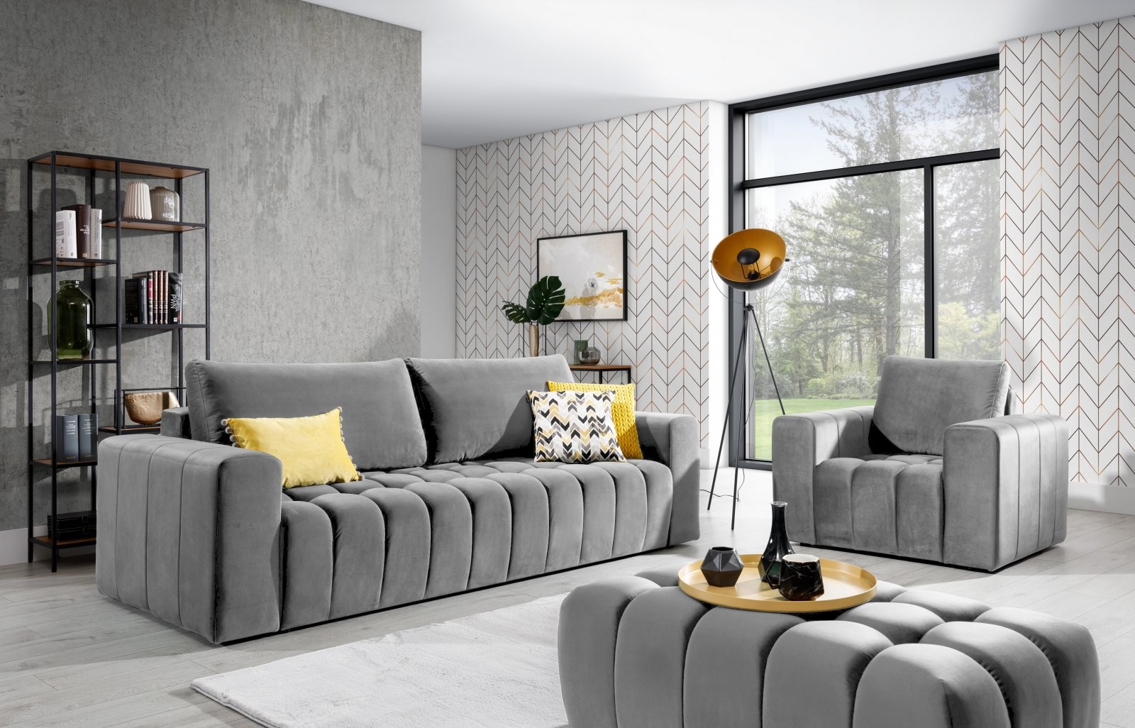 Set vključuje prostorno trosed, udoben enosed in vsestranski tabure, ki se lahko uporablja kot dodatno sedišče, opora za noge ali celo kot mizica.