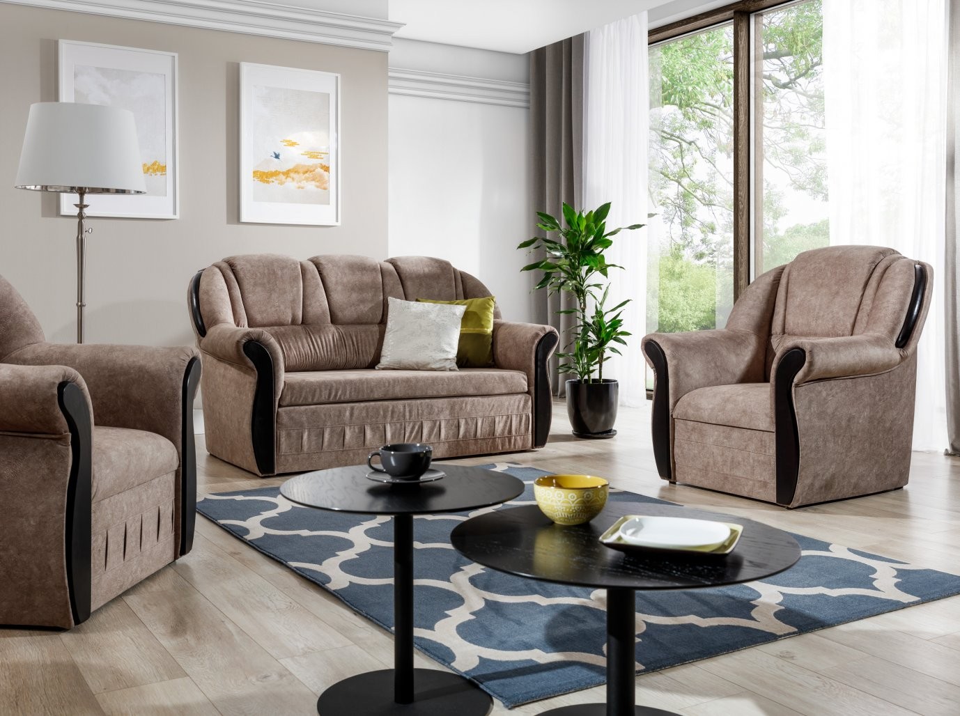 Elegantni set za dnevno sobo Lord 3+1+1 združuje klasično oblikovanje in brezčasen šarm, ki bo obogatil vsak prostor. Sestavljen je iz udobnega kavča in dveh naslanjačev, ki skupaj ustvarjajo popolno kombinacijo udobja in estetike. Kavč ima dodatno funkcijo spanja in prostoren predal za shranjevanje, kar ga naredi izjemno praktičnega za vsakodnevno uporabo.